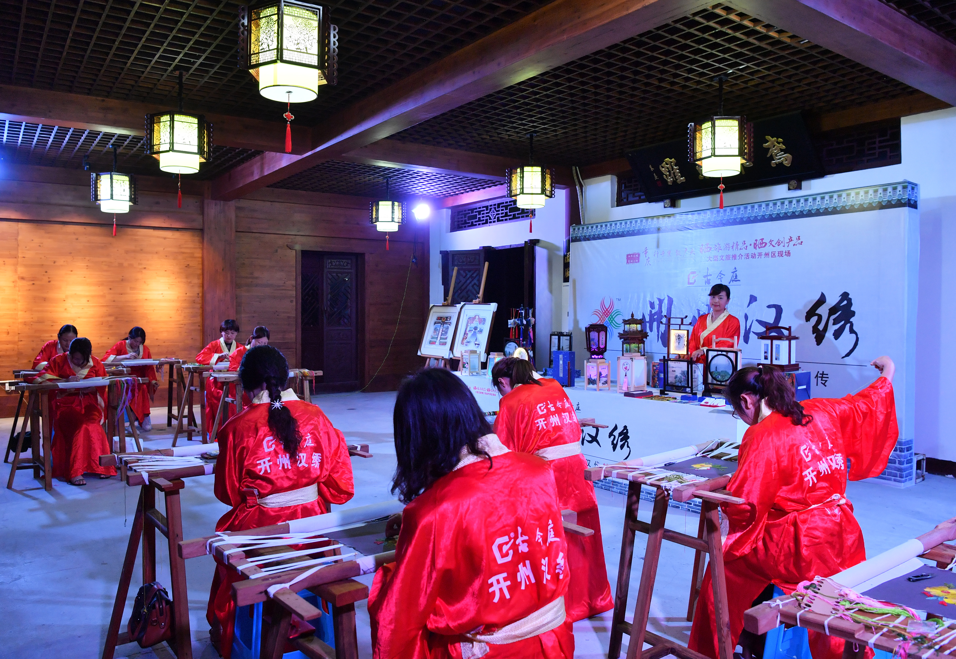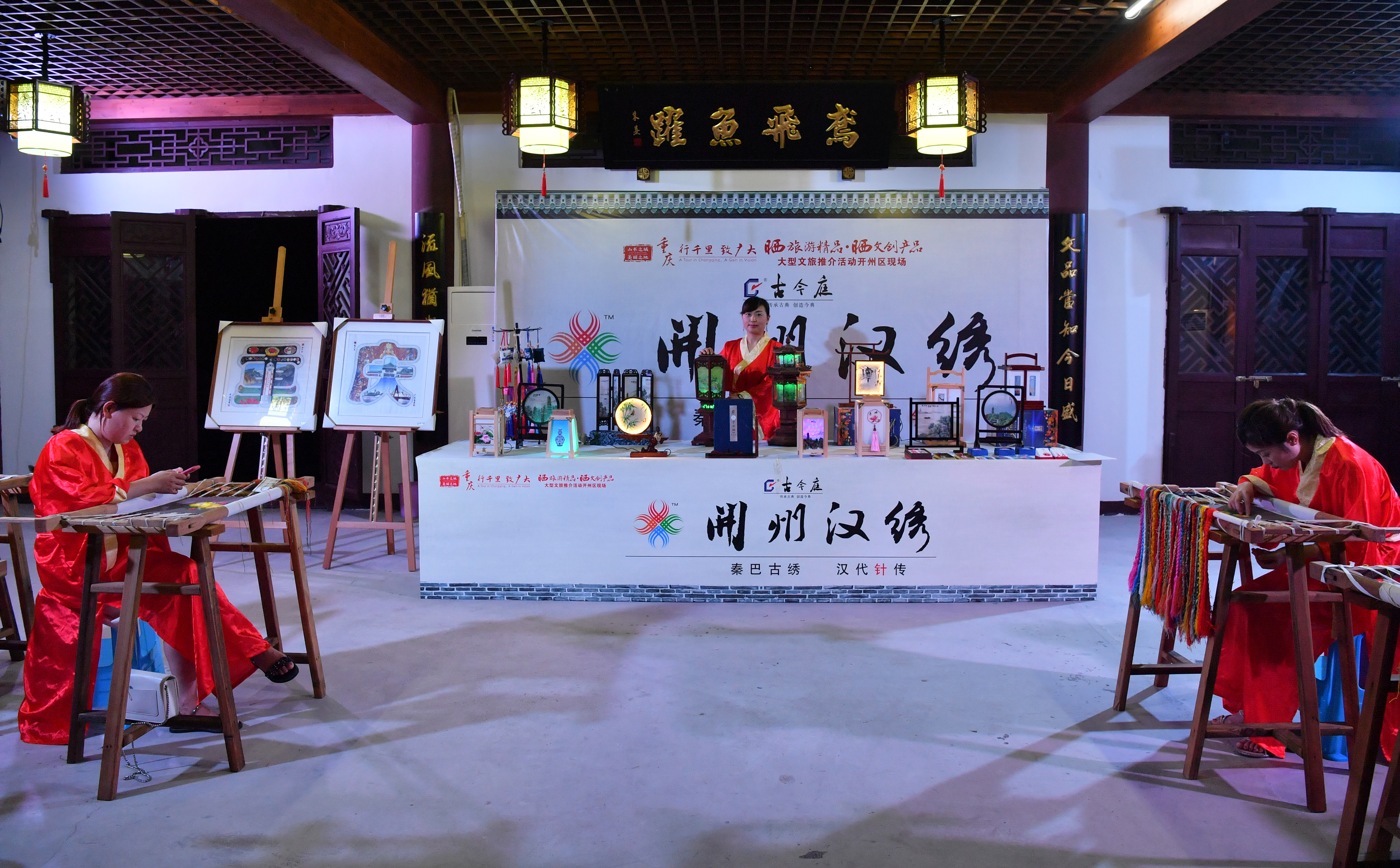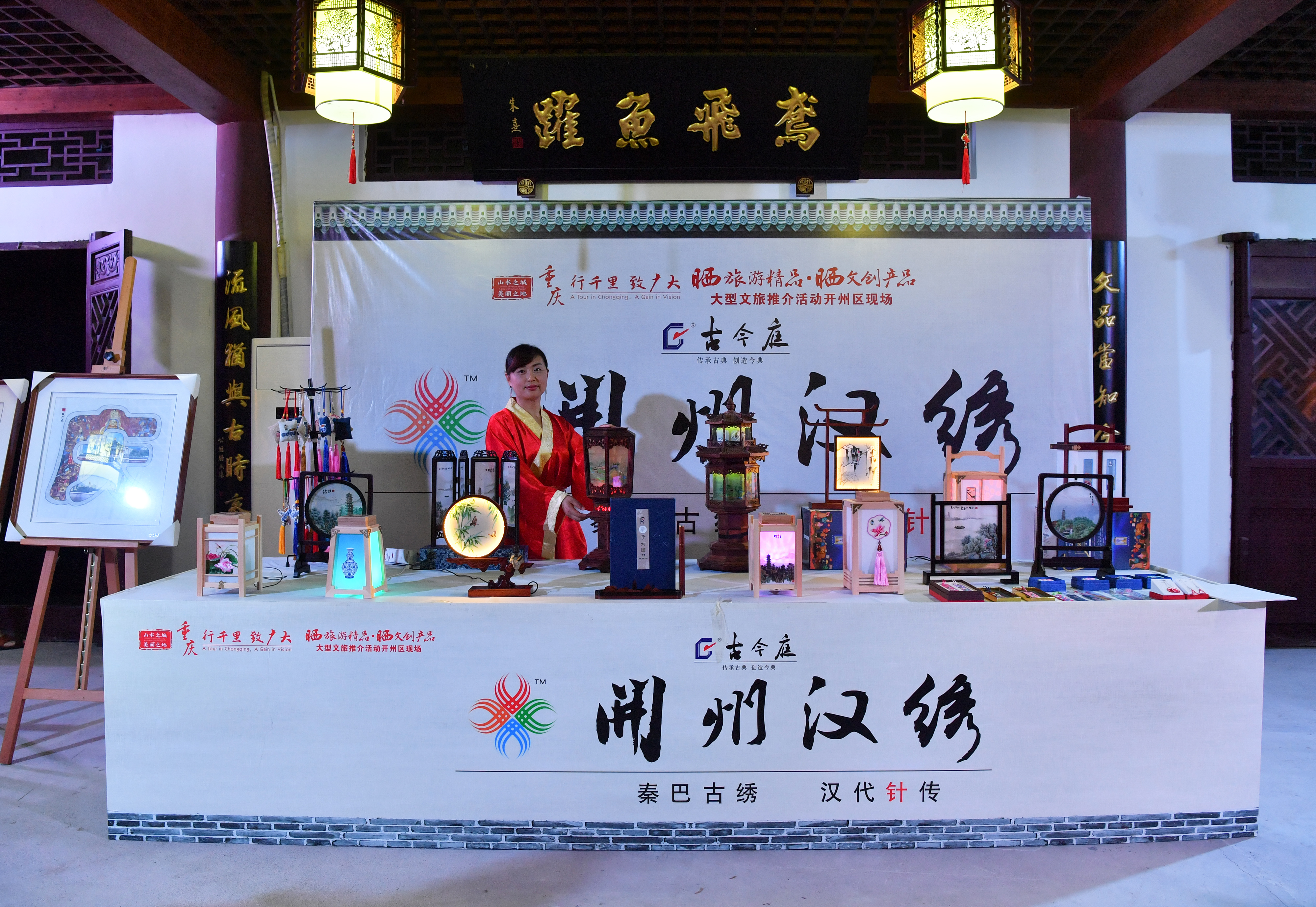 ↑6月11日,工作人员在“双晒”活动中展示推介文创产品——开州汉绣。