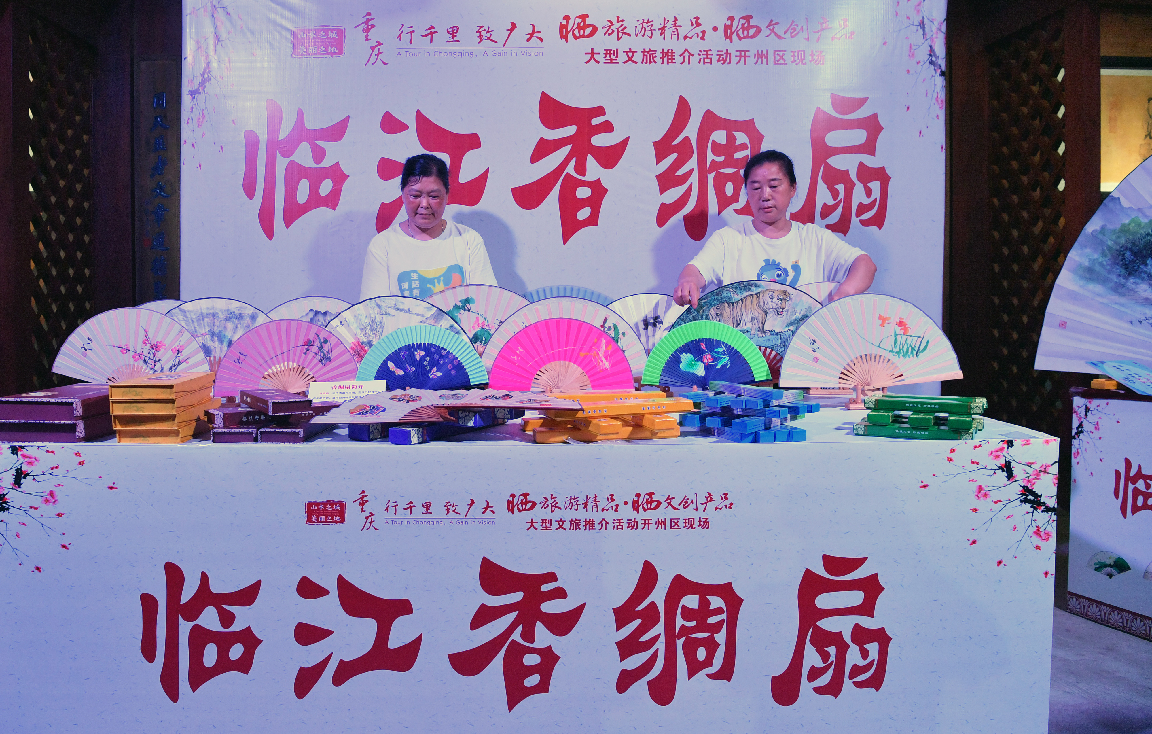 ↑6月11日,工作人员在“双晒”活动中展示推介文创产品——临江香绸扇。