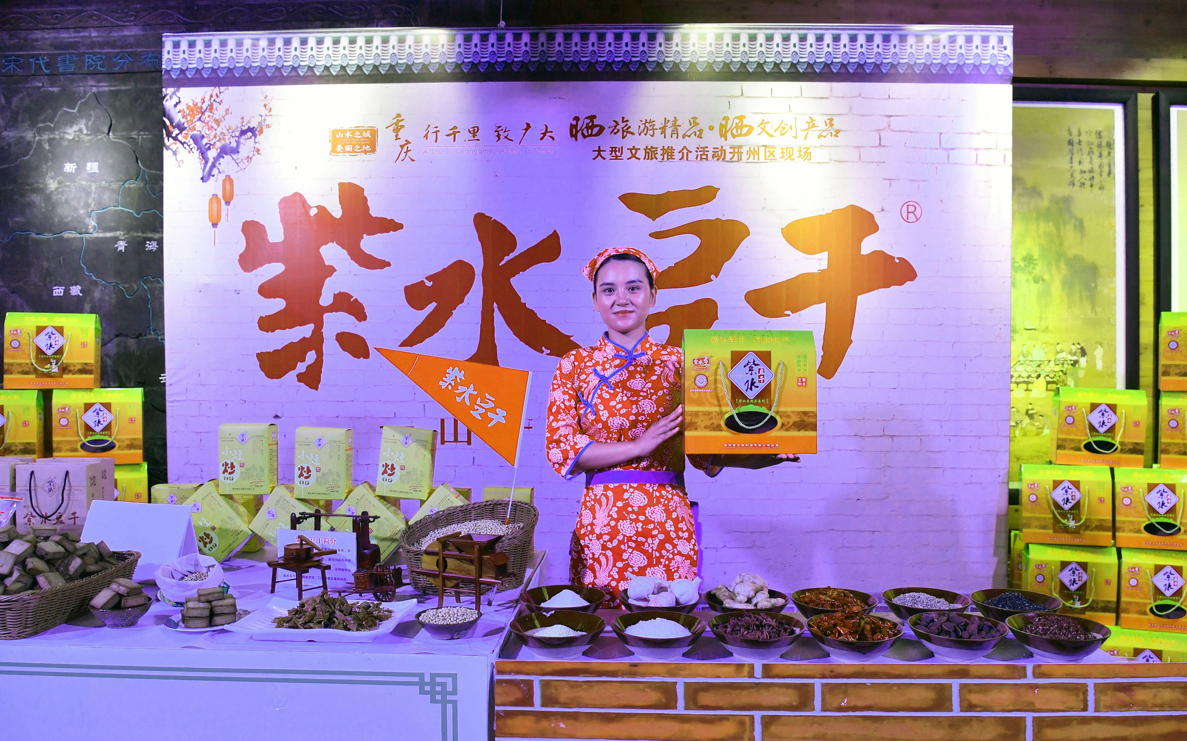 ↑6月11日,工作人员在“双晒”活动中展示推介开州特产——紫水豆干。