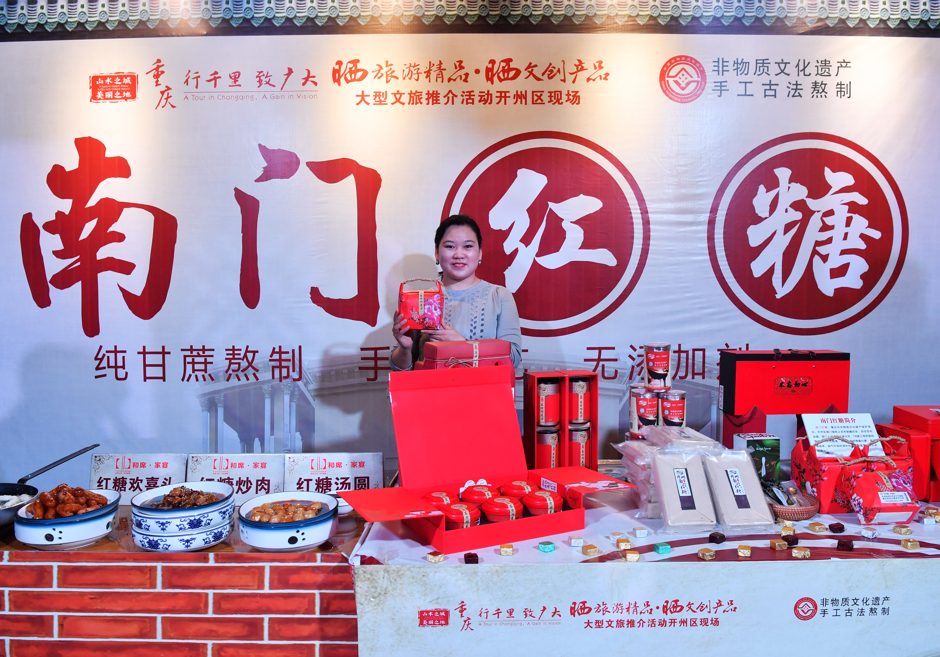 ↑6月11日,工作人员在“双晒”活动中展示推介重庆市非物质文化遗产——开州南门红糖。
