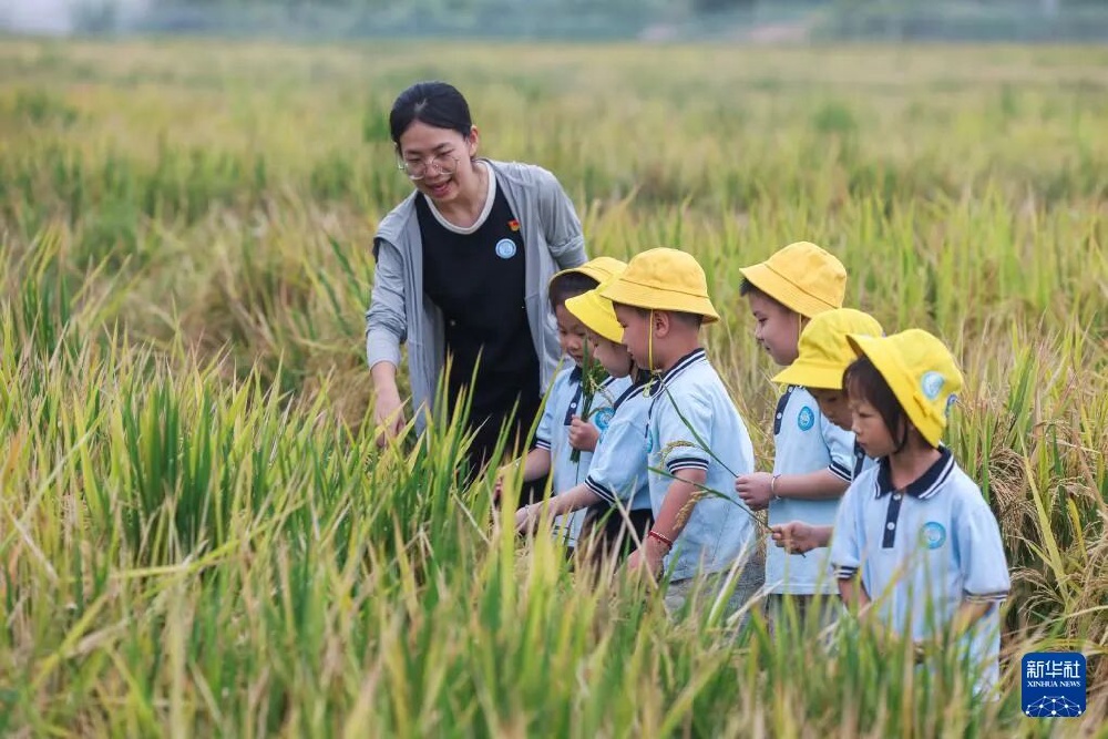 ▲10月14日,浙江省湖州市吴兴区东林镇中心幼儿园老师带着孩子们在东林镇保永村的稻田里近距离观察稻穗,了解水稻知识。记者 徐昱 摄/新华社