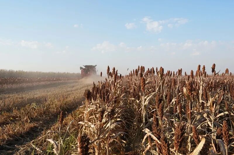 ▲10月11日,在位于黑龙江省肇东市的北大荒集团四方山农场有限公司,机械设备在进行高粱收获作业。记者 王松 摄/新华社