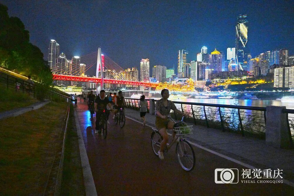 ▲8月7日,北滨路滨江骑行道,市民一边健身锻炼,一边欣赏山城夜景。首席记者 龙帆 摄/视觉重庆