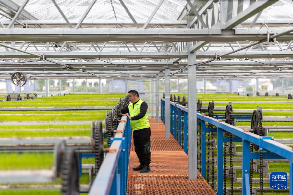 ▲重庆市永川区仙龙镇双星村智能育秧基地,技术人员在育秧育苗区查看秧苗的生长情况。记者 黄伟 摄/新华社