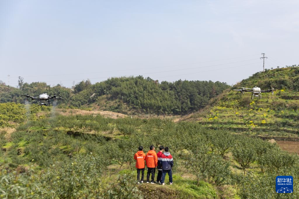 ▲重庆市梁平区屏锦镇万年社区,技术人员操作植保无人机喷洒营养液。记者 黄伟 摄/新华社