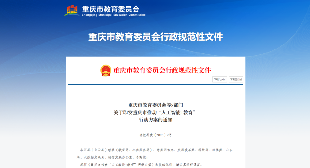 1月22日,记者获悉,市教委等8部门印发了《重庆市推动“人工智能+教育”行动方案》(以下简称《方案》),部署五方面重点任务,推动人工智能技术融入教育教学全要素全流程,构建“人工智能+教育”发展新格局。