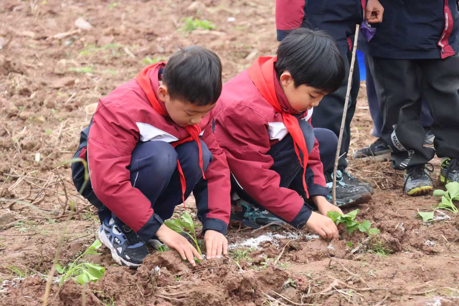 启动仪式现场,学生们在教师的带领下,走进“班级责任田”进行播种育苗。“把泥土轻轻固定在根周围,就可以让小苗‘站得稳’。”二年级(7)班学生项诗函一边小心栽下冬寒菜苗,一边分享她学到的种植技巧。