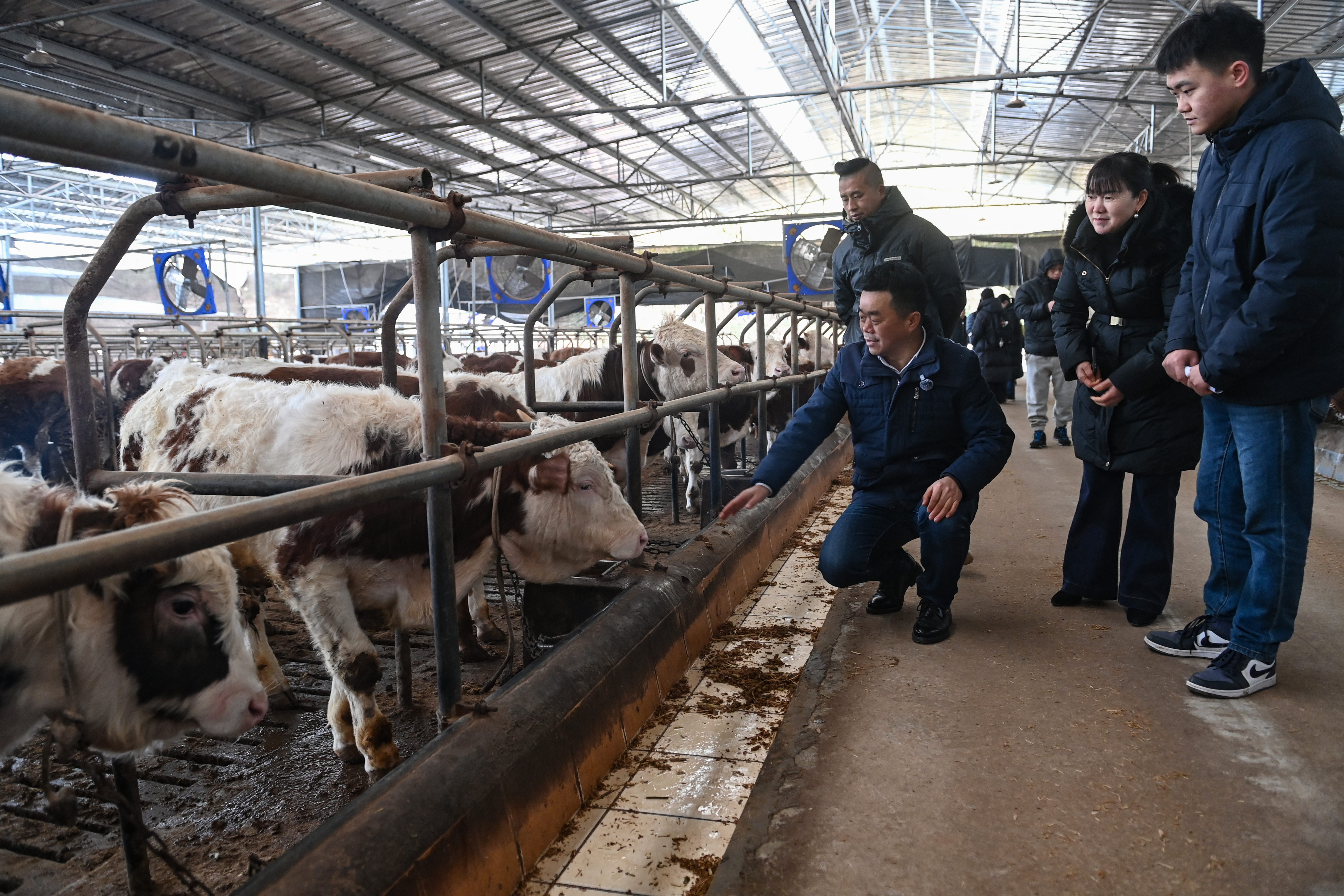 1月24日上午10点过,涪陵区重庆端宏牲畜养殖有限公司的养殖基地里,养殖户黄绪玲和儿子冉鑫宏正忙着给近800头肉牛喂食,此时,西南大学动物科学技术学院院长赵永聚教授和大足区农业技术推广研究员王建国来到养殖基地,为他们送来专业技术指导。