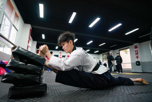 1月22日,在市残疾人跆拳道训练基地,一位年轻小伙子紧盯着教练手中的脚靶,左腿绷直用力一蹬,靶面“啪”地震颤;教练换靶斜举,他随即左脚勾起上踢,脚尖擦靶发出“咻”的一声……