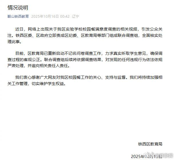 辽宁省鞍山市铁西区教育局微信公众号10月16日发布情况说明称,铁西区委、区政府立即责成区纪委、区教育局等部门组成联合调查组,全面核实处理此事。目前,区教育局已重新启动不记名问卷调查工作,力求真实听取学生意见,确保调查过程的客观公正。联合调查组后续将依据调查结果,对发现的任何违规行为依法依规严肃处理,并追究相关责任人责任。(据10月16日澎湃新闻)