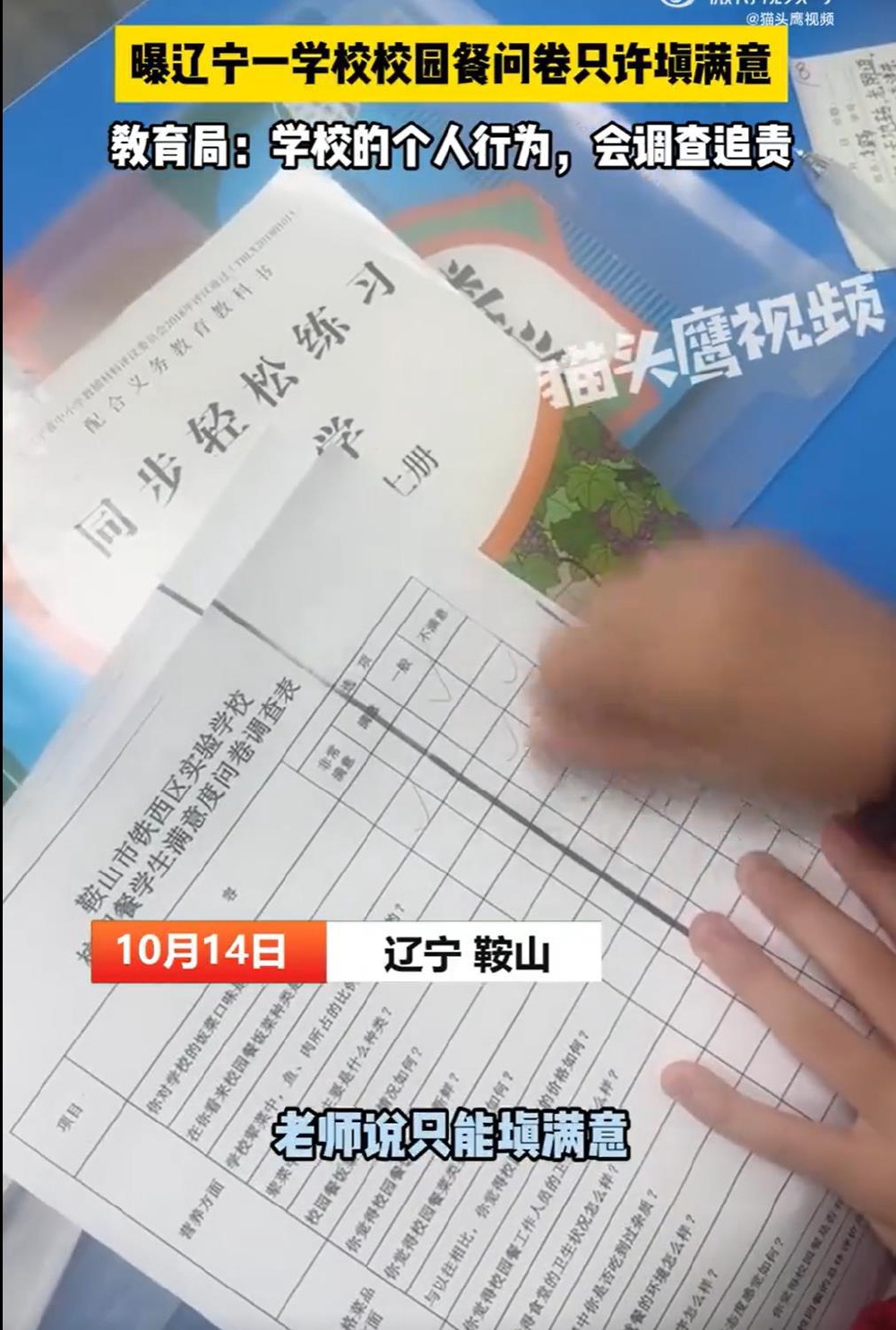 10月14日,辽宁鞍山。网传铁西区实验学校校园餐学生满意度问卷调查表,老师只让填非常满意和满意,若填一般和不满意都要擦掉重填。对此,铁西区教育局回应:“这是实验学校个人的行为,学校的满意度调查表与教育局发下的表是不一样的。”