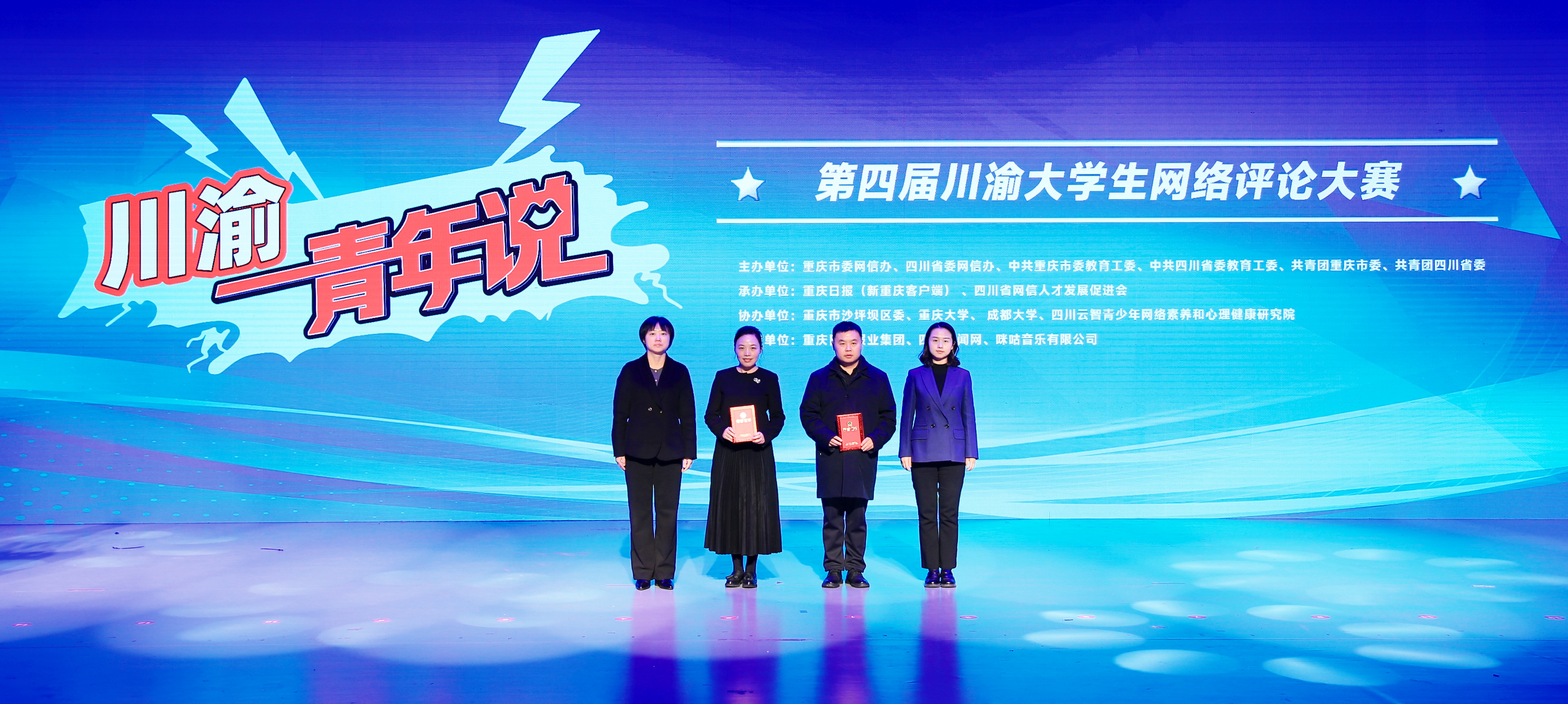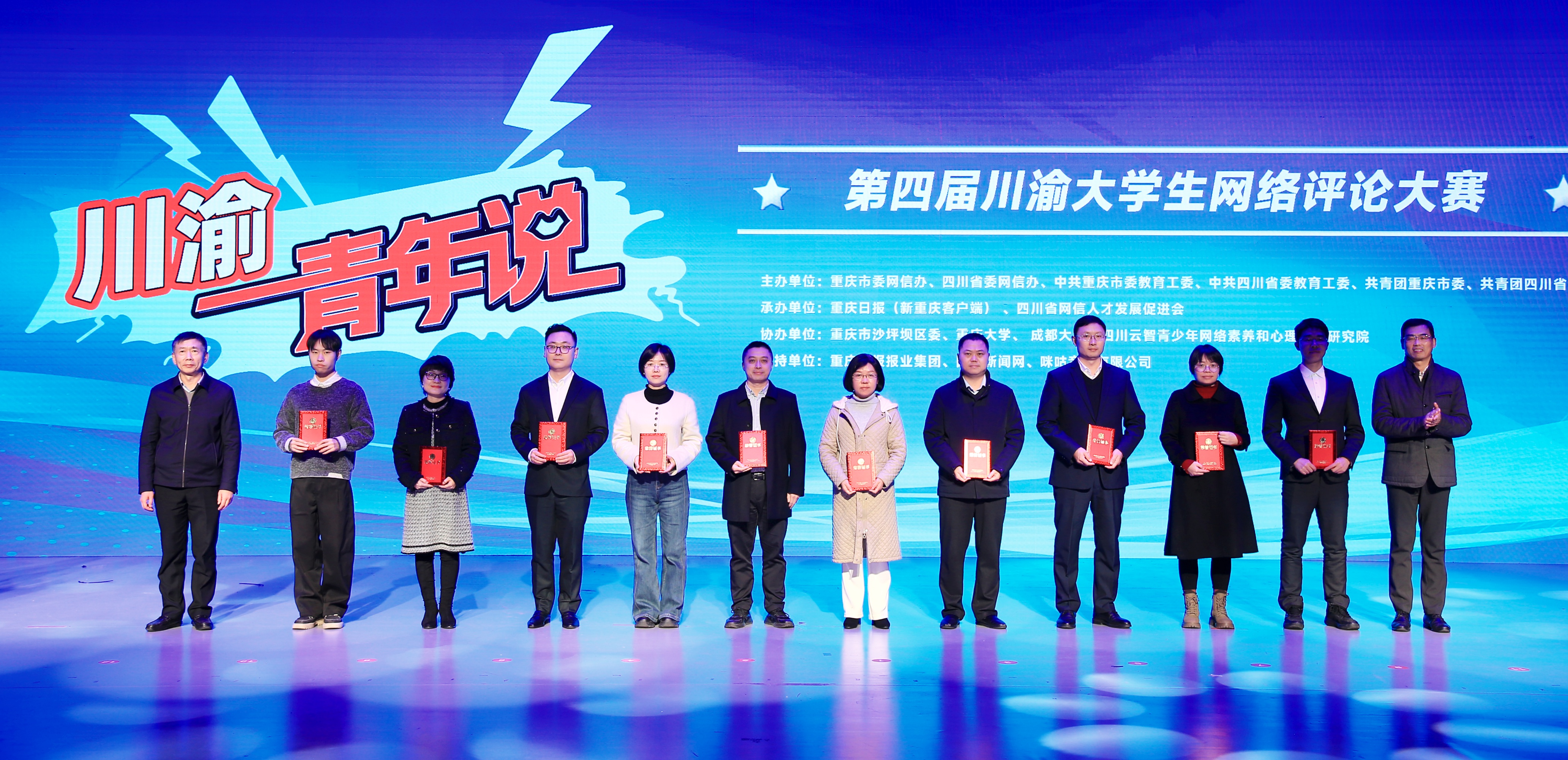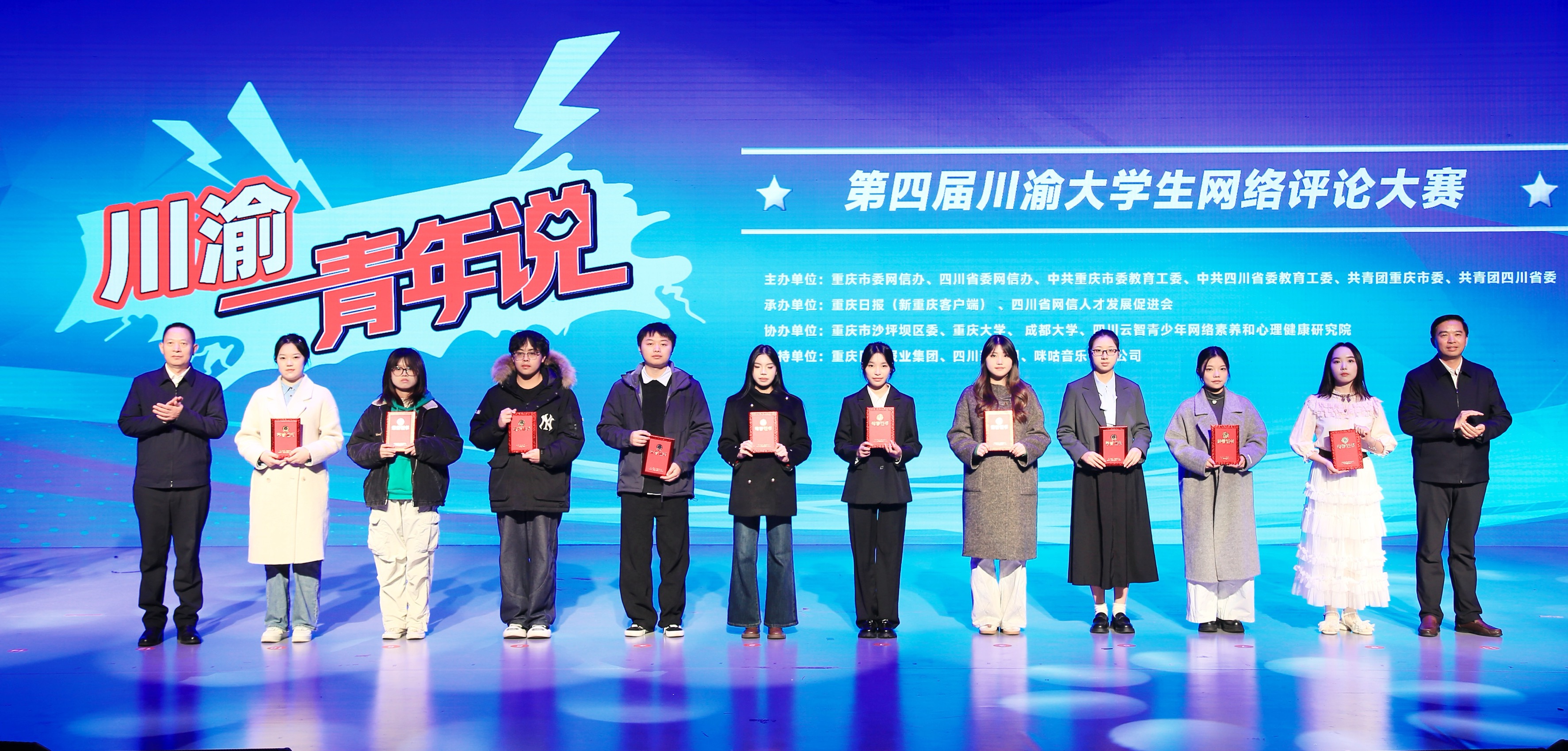 ▲2025年12月17日,成都大学,“川渝青年说”第四届川渝大学生网络评论大赛颁奖仪式现场,重庆四川网信办领导为获奖选手代表颁奖