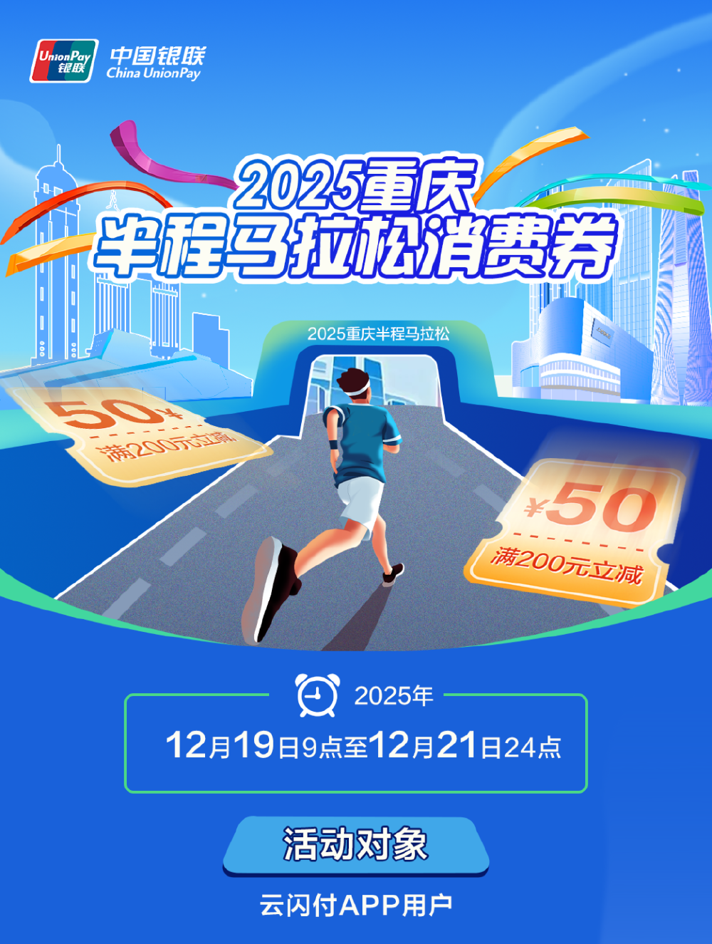 2025重庆半程马拉松消费券:12月19日09:00至12月21日24:00,消费者通过云闪付APP(领取途径:下载云闪付APP——云闪付首页——政府消费券—巴南区消费券专区)可领取消费券,领取后可前往巴南适用活动商户使用,通过云闪付支付可享受“满200元立减50元”优惠。
