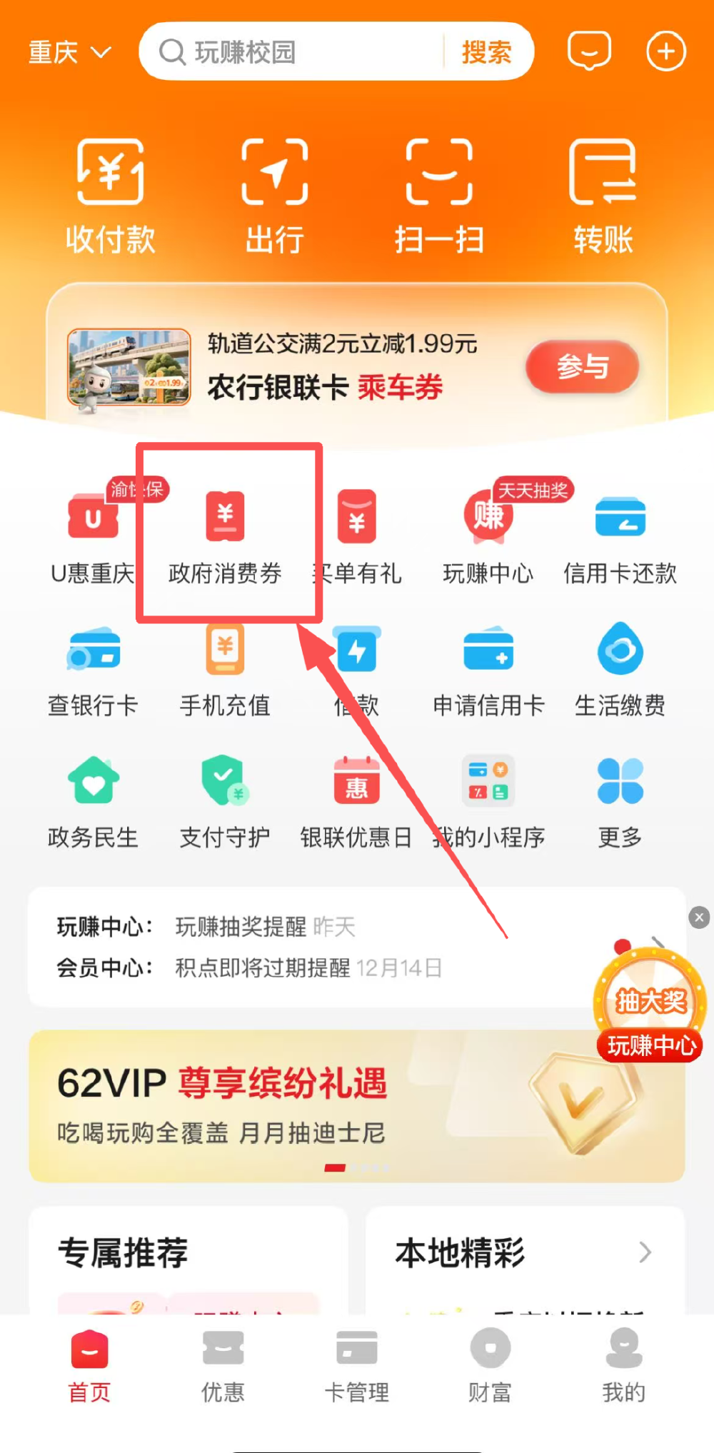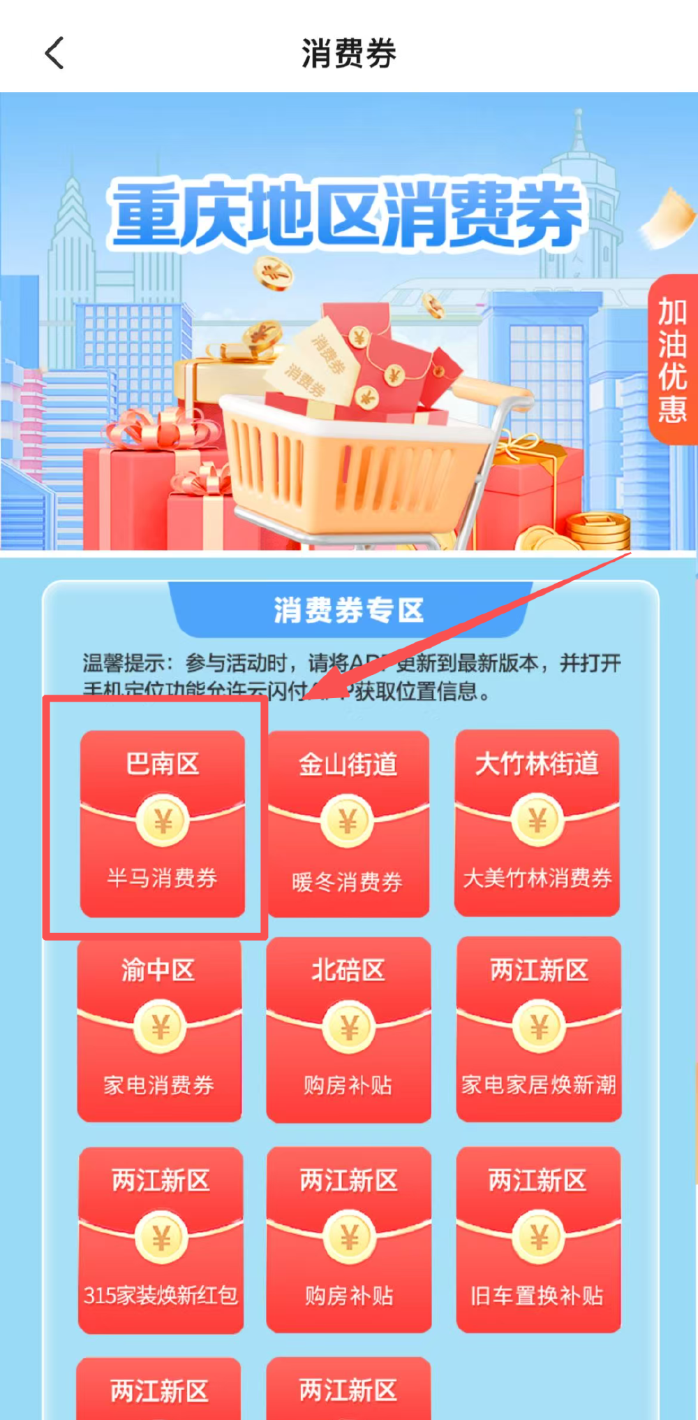 2.点击首页政府消费券,进入重庆地区消费券页面,选择巴南区半马消费券。