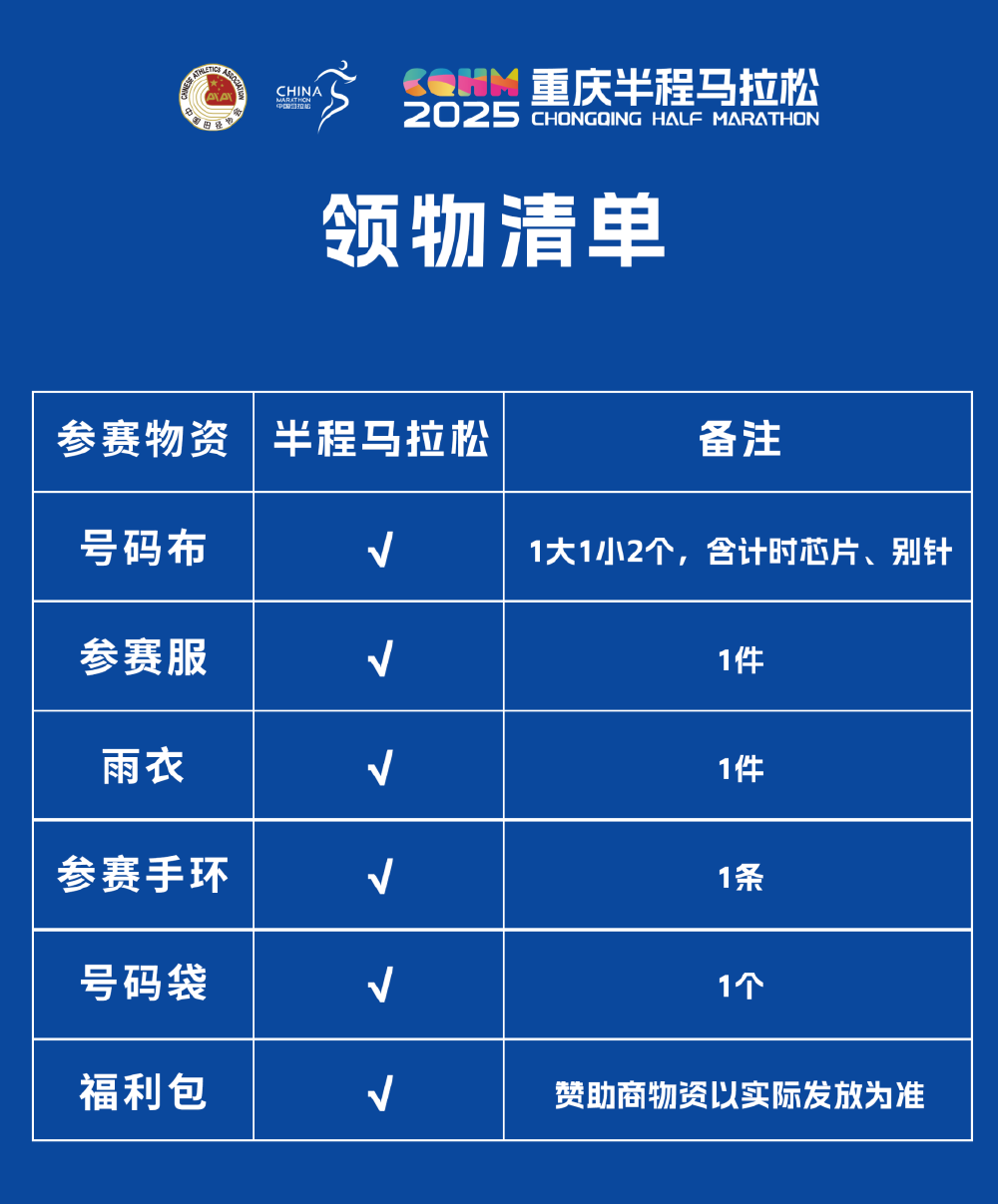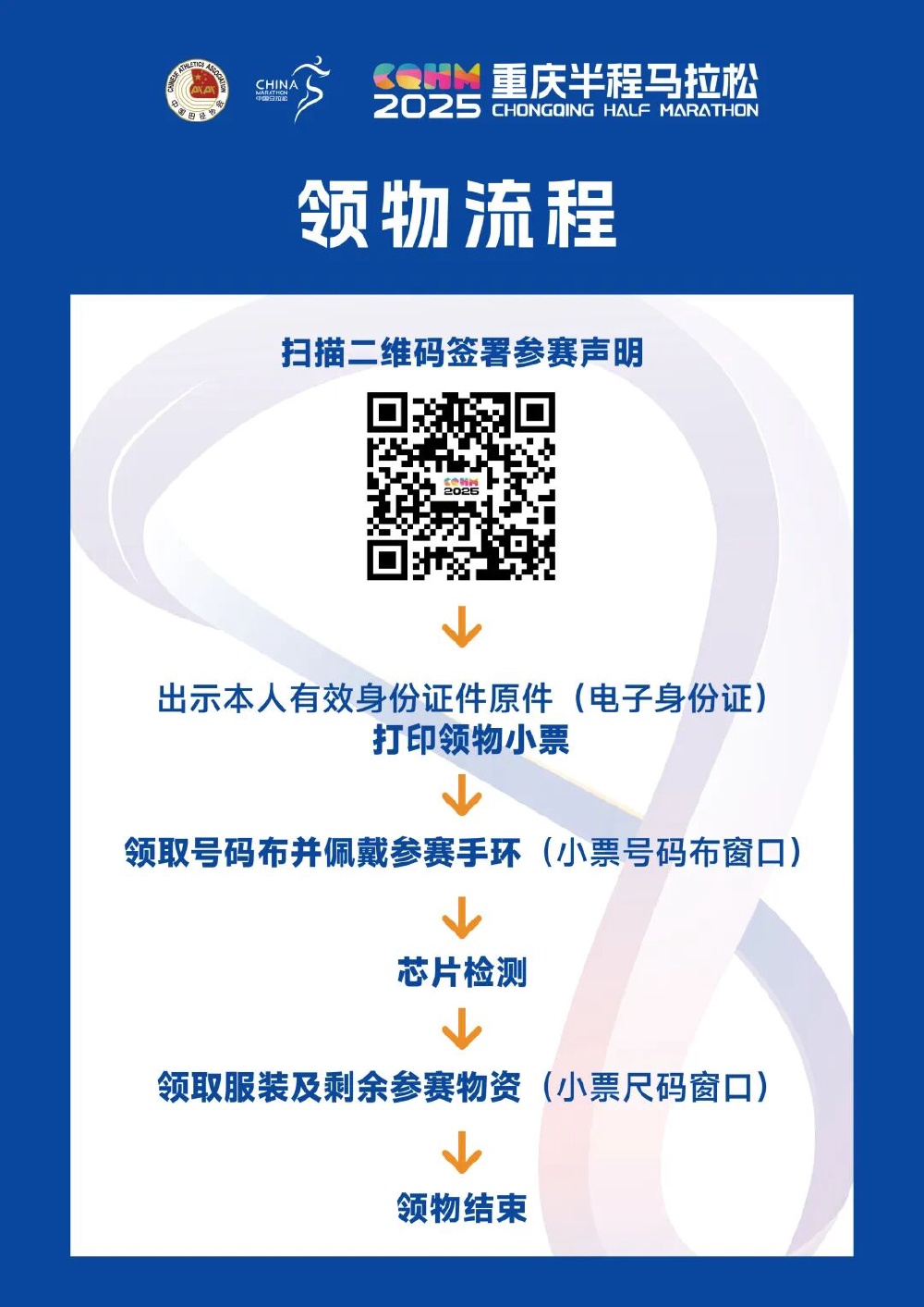 1. 2025重庆半程马拉松参赛物资仅限参赛选手本人在规定时间内前往规定地点领取,不可由他人代领;