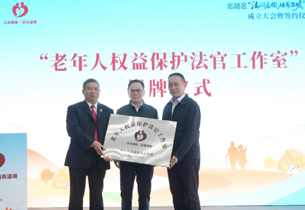 北碚区委常委、政法委书记陈德胜向北碚区法院与区委老干局授“老年人权益保护法官工作室”牌匾,标志着全区老年人权益保障工作迈入资源整合、协同发力新阶段。