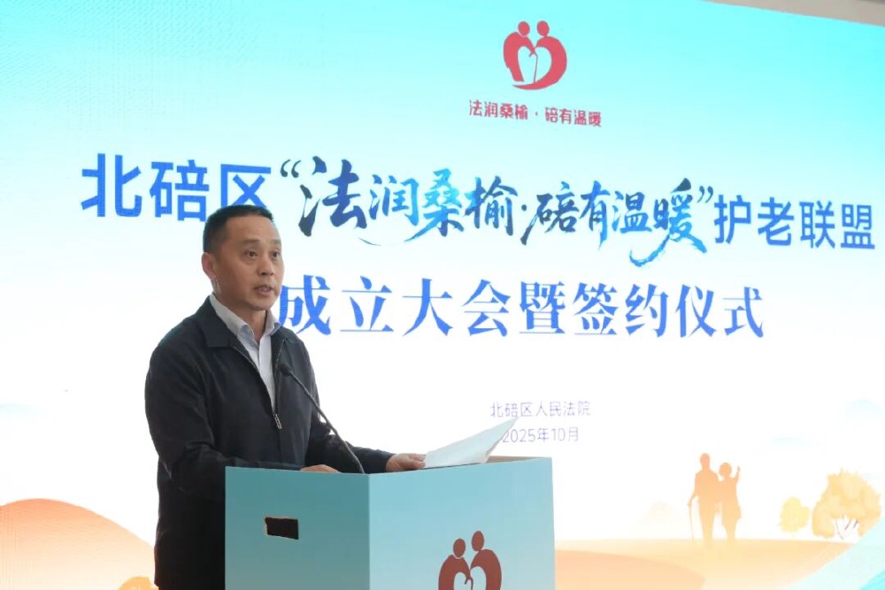 为深入贯彻落实国家积极应对人口老龄化的战略部署,生动践行以人民为中心的司法理念,全面提升老年人权益司法保护的质量与水平,2025年10月28日下午,北碚区法院携手区公安、检察、司法、民政、老干部局等多部门,联合举行“法润桑榆·碚有温暖”护老联盟成立大会暨共建协议签约仪式。市一中法院党组成员、副院长李春燕,北碚区委常委、政法委书记陈德胜,北碚法院党组书记、院长陈久红,市人大代表陈卓、马琴、杨柳,市政协委员万友洪以及区相关部门领导等出席本次活动。
