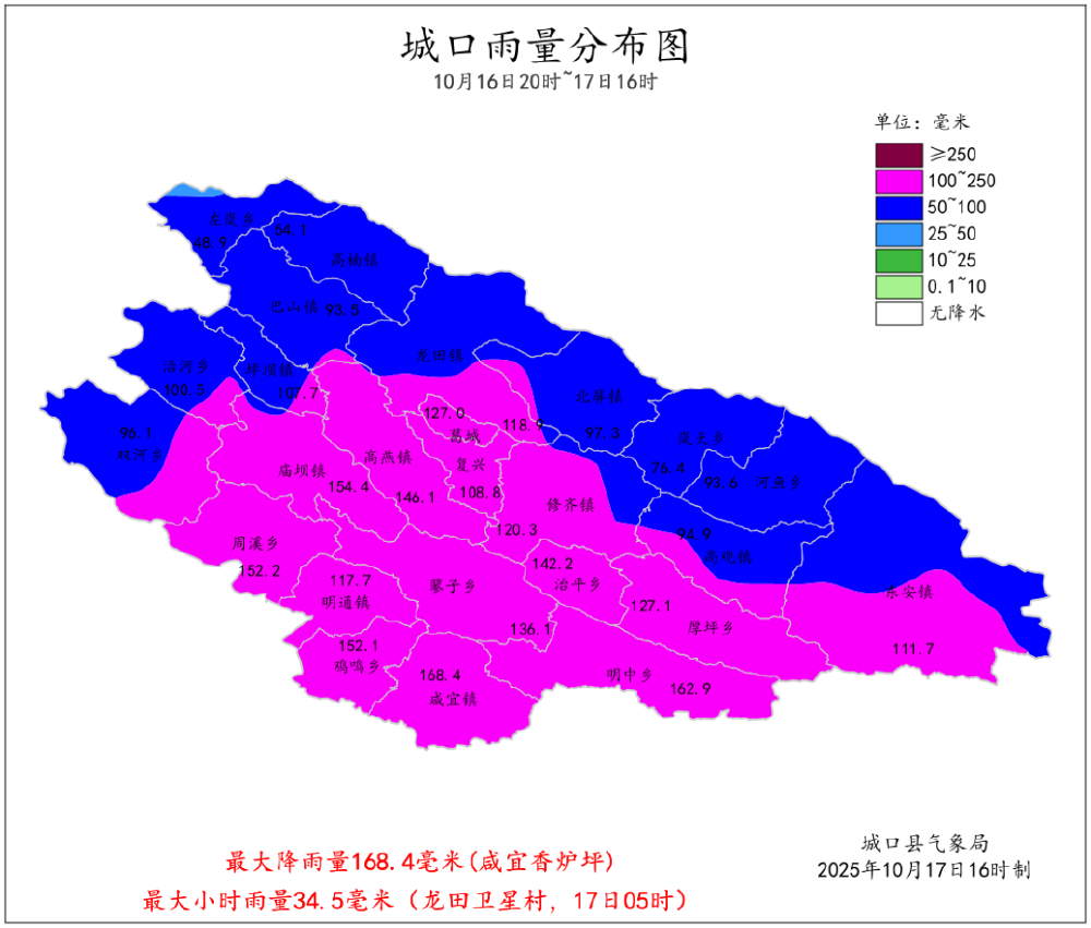 10月16日20时到17日16时,城口县普降暴雨到大暴雨,最大降水量168.4毫米(咸宜镇香炉坪),最大小时雨量34.5毫米(龙田镇卫星村,17日05时),城区降水量127.0毫米。预计本轮降雨将持续至今天傍晚,雨量0~5毫米。