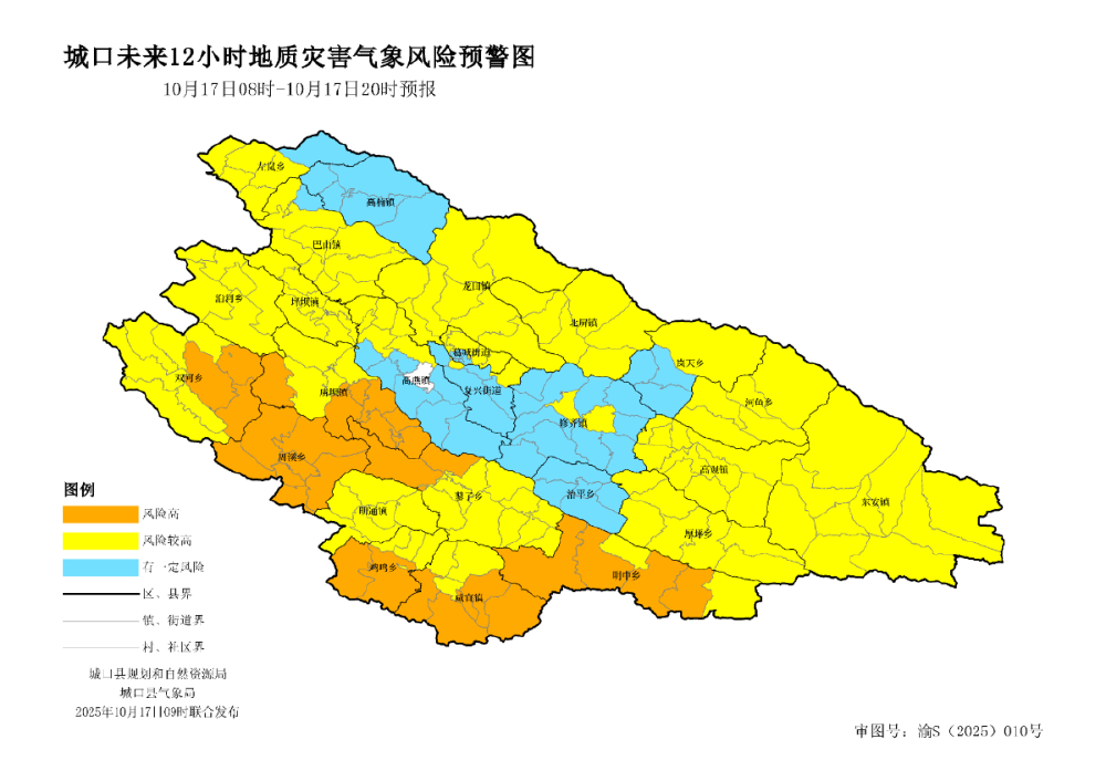 10月17日9时,城口县规划和自然资源局、城口县气象局联合发布城口未来12小时地质灾害气象风险预警。