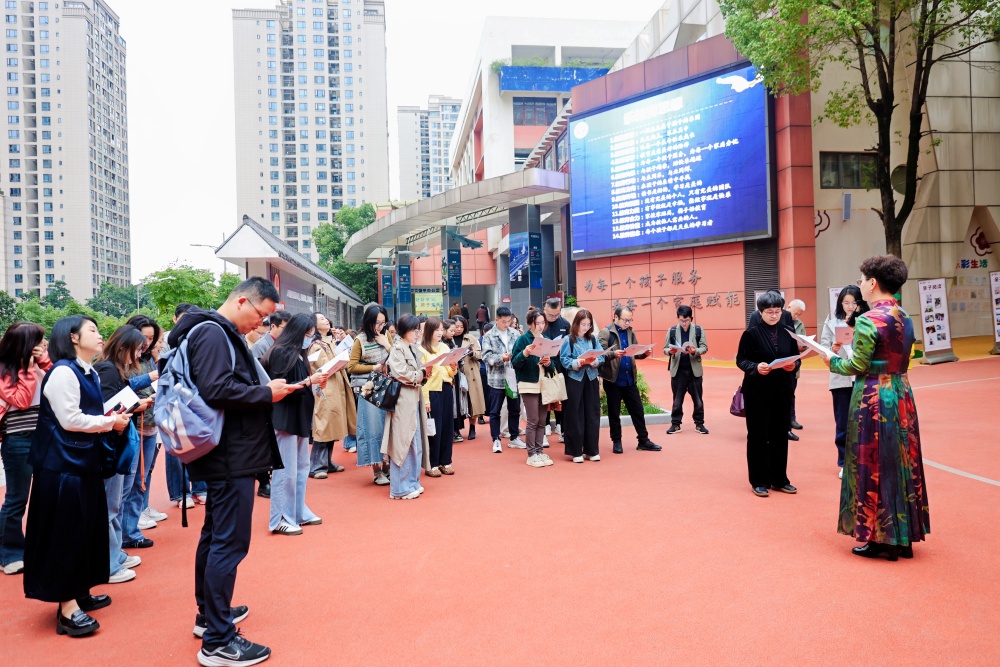 在校大门口,新城小学校党总支书记陈中梅为来访领导介绍了当日的九个观察点,并引导大家通过多元形式,深度体验“乐教育”校家社协同育人的生动实践。