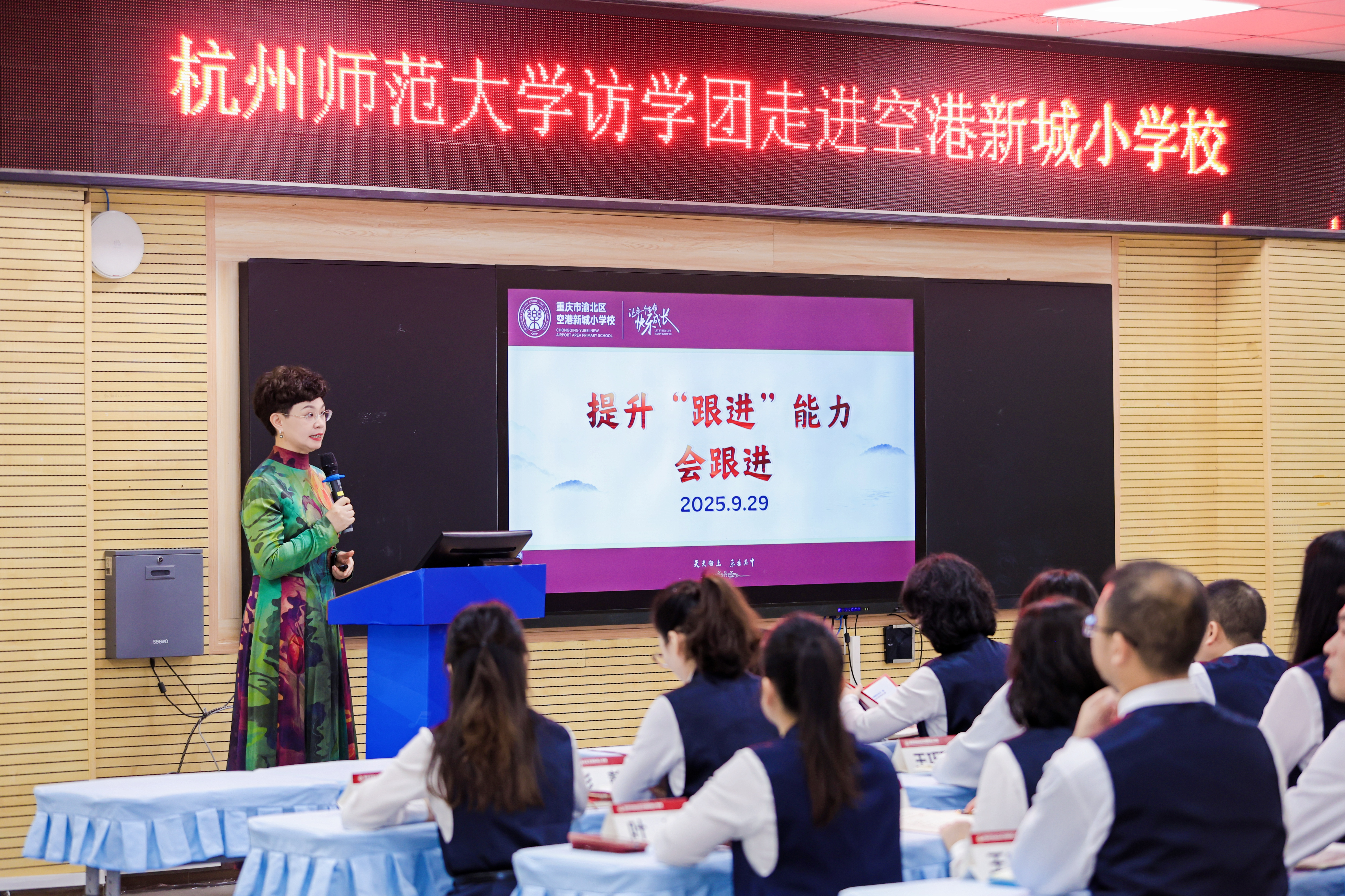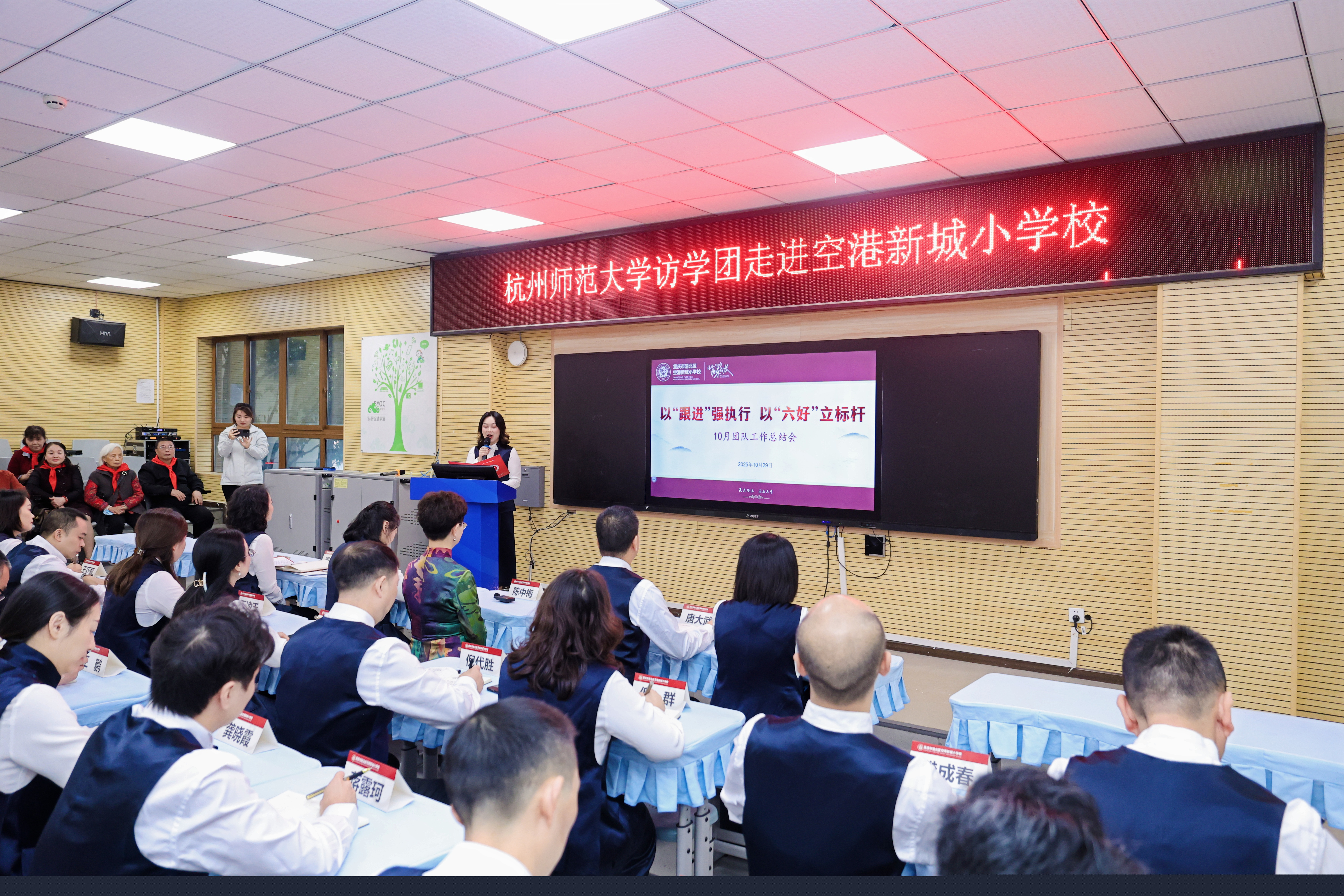 10月29日,渝北区空港新城小学迎来了一场聚焦教育数字化转型与协同育人创新的深度交流活动。由杭州师范大学党委委员、副校长戴丽敏带队的附属中小学书记校长访学团,与重庆自然资源部重庆测绘院、北京大学-TBI人工智能联合实验室、渝北区技术装备中心、WPS重庆工作部及重庆本地部分小学专家、校长们一道,系统探访了新城小学“校家社协同育人”的实践成果,解码“乐教育”理念下基础教育高质量发展的新范式。