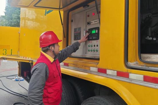 故障发生后,服务队驾驶着2辆发电车火速抵达现场。接线、调试、启动……一系列操作有条不紊,经过高效作业,晚上10点发电车成功接入学校供电系统,教学楼、宿舍区的灯光陆续亮起,原本因停电产生的慌乱瞬间消散。“2辆发电车轮流工作,先保障关键区域用电,绝不能影响师生正常生活。”服务队队员魏柳生一边盯着设备参数,一边向学校后勤负责人做出保供承诺。