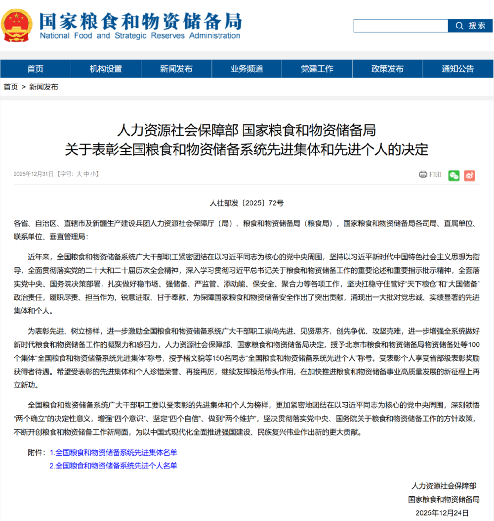 近日,人力资源社会保障部、国家粮食和物资储备局联合印发《关于表彰全国粮食和物资储备系统先进集体和先进个人的决定》,授予全国粮食和物资储备系统100个集体“先进集体”称号、150名个人“先进个人”称号。