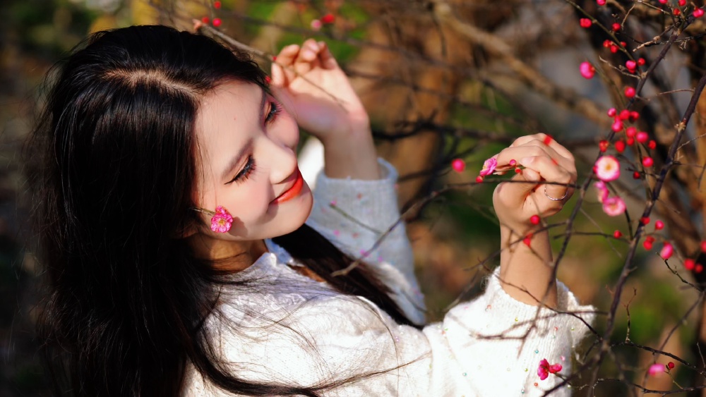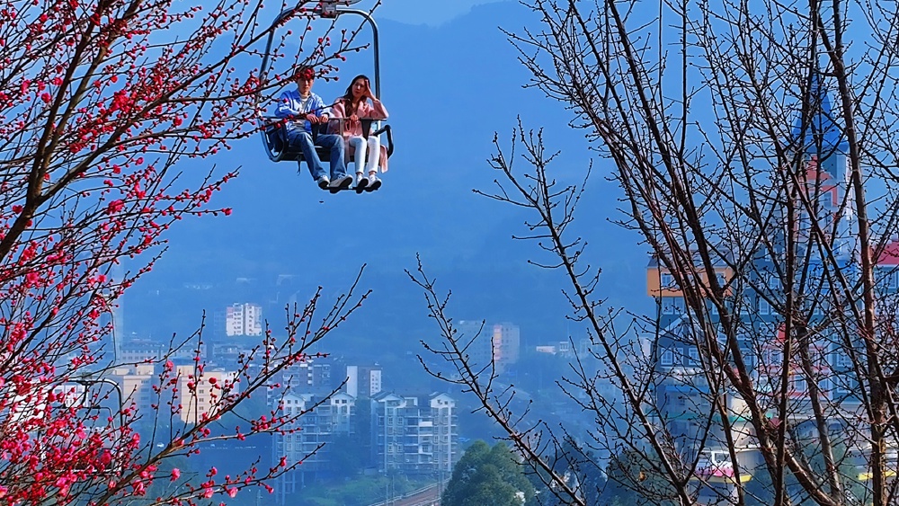 循索道徐行,俯仰皆景。远望,红梅如胭脂轻染青山,又似朝霞暂栖林杪,簇簇绽放在蓝天下,点亮了整个山谷。游客或乘缆车凌空而过,看脚下花潮起伏,如揽云入怀;或闲步小径幽处,轻抚梅枝,细嗅暗香,与自然悄然对话。更有游人衣袂翩跹,一袭旗袍仿佛携着旧时光韵,穿行于疏影横斜之间,人与梅影相映,宛若从古画中走来,为这片红梅山野平添几分流动的诗情。笑声轻盈,快门脆响,风过梅梢簌簌低语,交织成一曲冬日里的春之序曲。