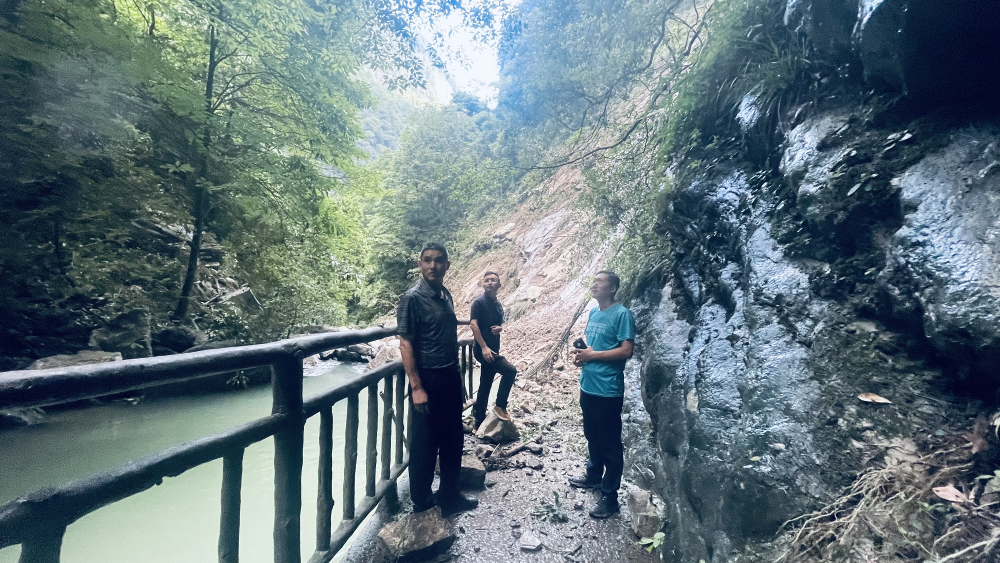 ▲涪陵区规资局工作人员现场踏勘武陵山大裂谷景区危岩崩塌情况。