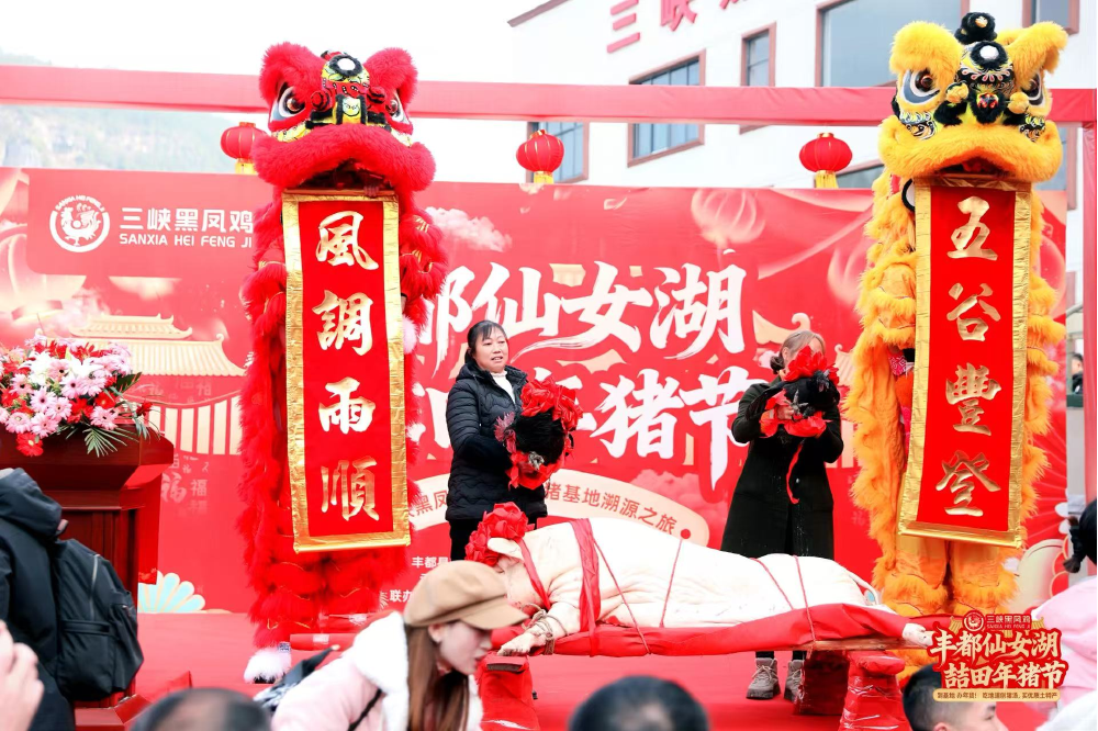 “这不是简单的节庆,而是一次从田地到餐桌的信任传递。”活动现场,一位合作社农户摸着胸前大红绸花,笑容朴实。在他的身后,四名壮汉抬着戴红绸的年猪,两名老乡怀抱同样装扮的黑凤鸡,沿着活动现场向游客、采购商等来宾巡游展示。大家纷纷上前触摸猪头、轻碰鸡冠,讨一个“鸿运当头”“纳吉迎祥”的好彩头。