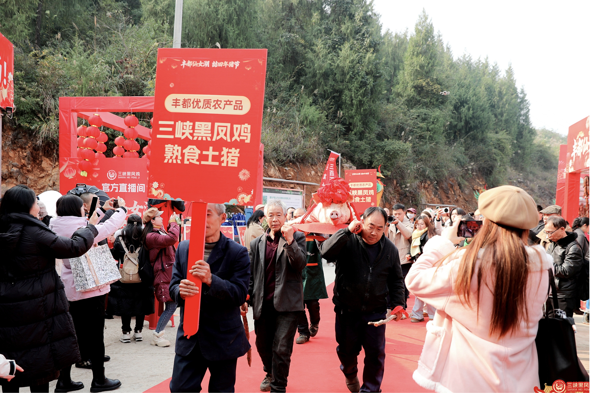 上午11时30分,随着一声浑厚的铜锣响彻山谷,“丰都仙女湖·喆田年猪节”正式开市。仙女湖镇政府代表与企业负责人共同宣告以“三峡黑凤鸡×熟食土猪”为主题的溯源之旅拉开大幕。
