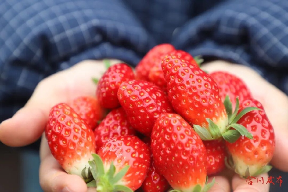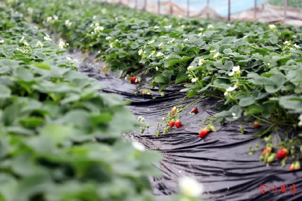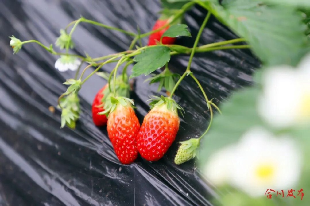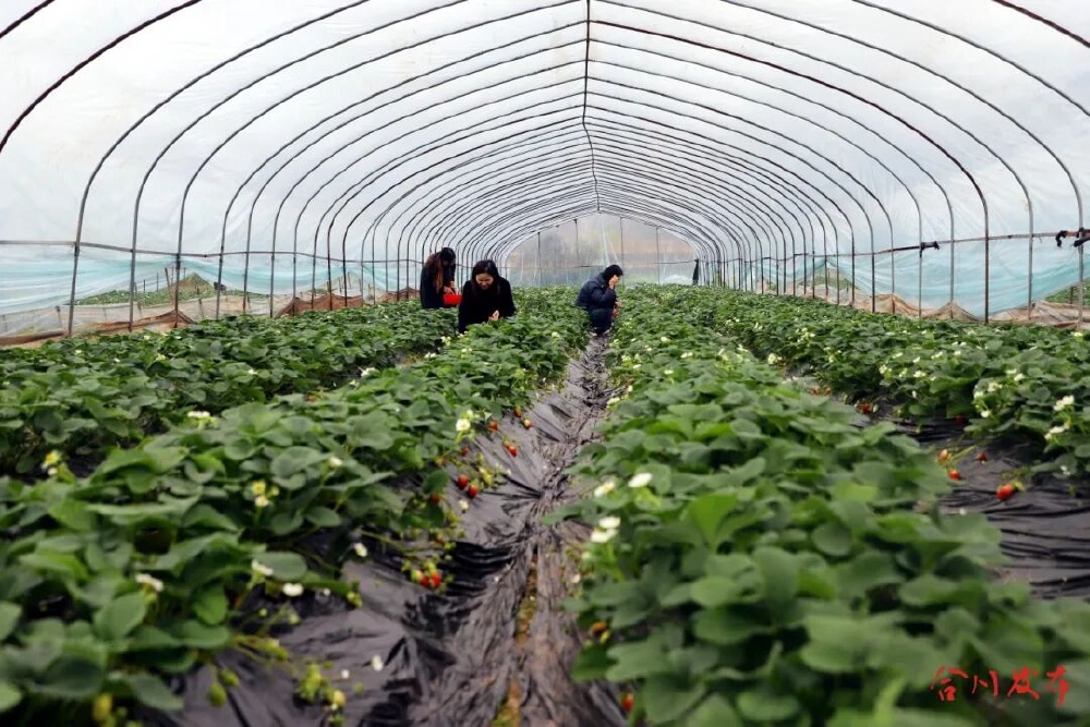 冬至后的合川区钱塘镇学堂村菌香草莓园,一栋栋温室大棚里已是一片“红火”景象。成排的田垄间,绿叶下缀满鲜红饱满的草莓,不少已经熟得透亮。