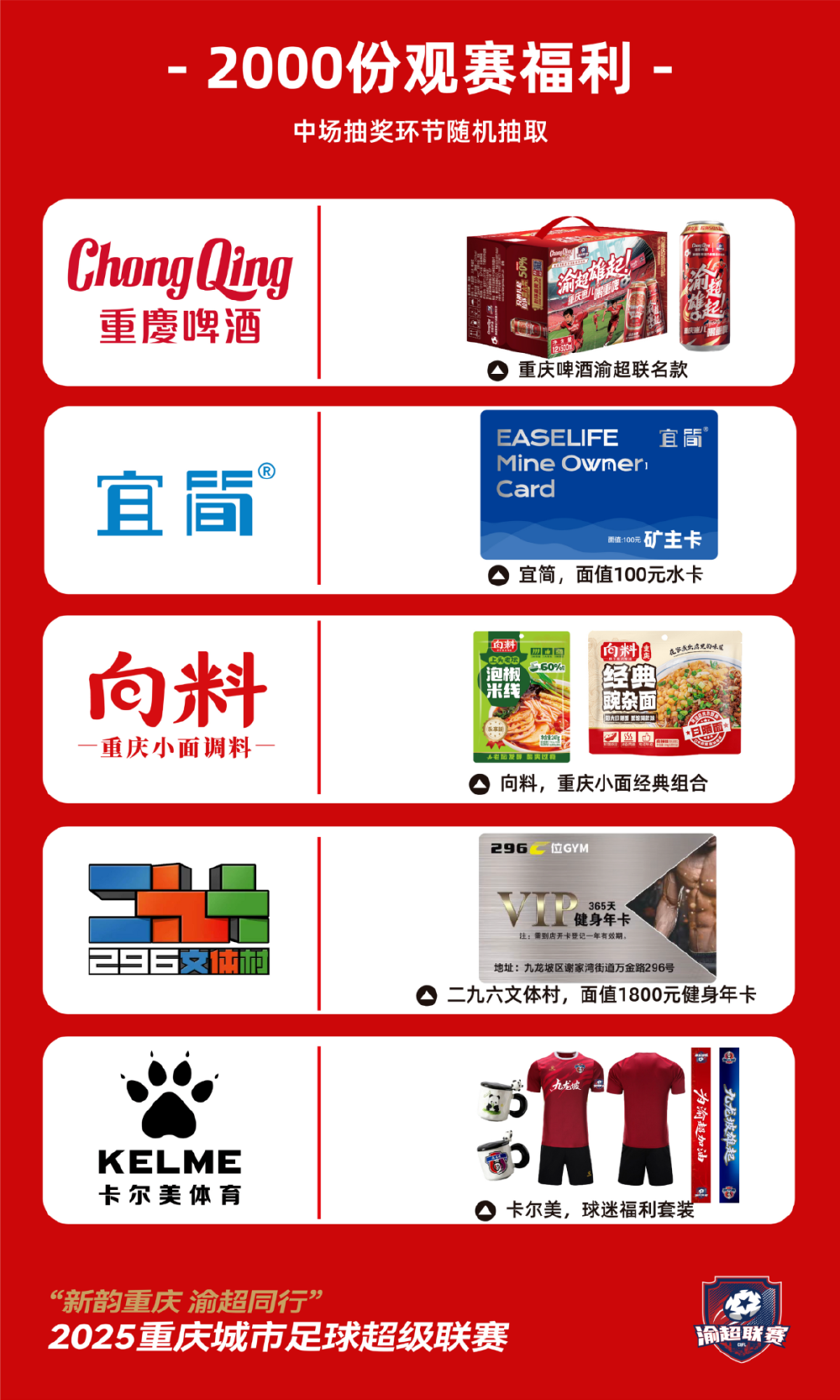 本场比赛门票将于12月1日(周一)15:00正式开售。届时,球迷朋友们可以通过登录大麦网网页端或使用大麦APP进行购票,共同见证这场期待已久的城市足球对决。值得一提的是,九龙坡队主场已为大家准备好共计2000份中场抽奖福利!包含重庆啤酒渝超联名款、宜简水卡、向料重庆小面组合、296文体村健身年卡、卡尔美套装等……热情邀请球迷们相聚奥体,用掌声和欢呼,唤醒尘封已久的热血记忆,续写属于重庆足球的燃情篇章!
