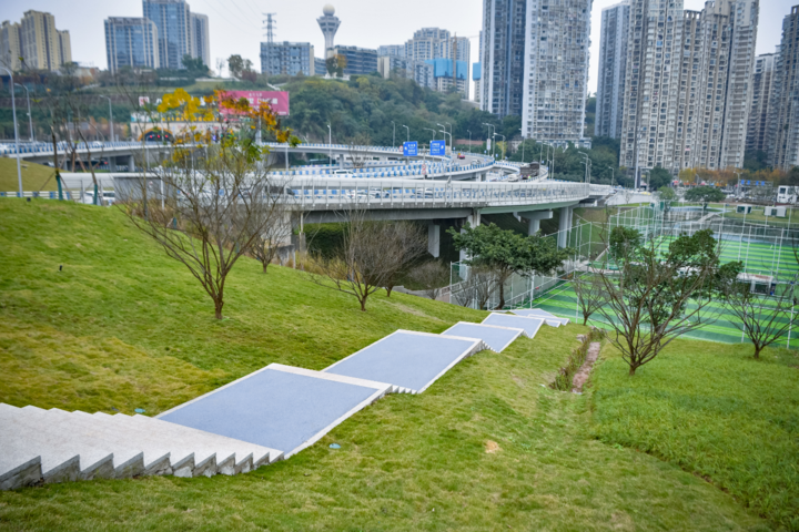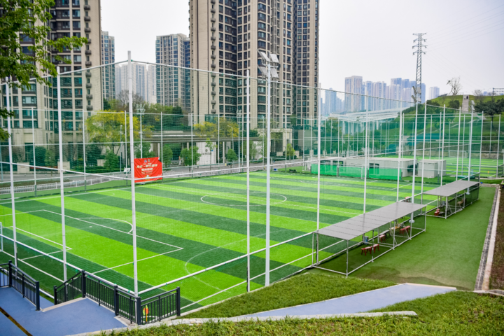 改造前,这片70575平方米的区域曾是草坪杂灌交错、临时材料乱堆的“城市疮疤”,甚至出现违规种菜现象。如今,通过边坡整治、垃圾清运、功能重建,这里已成为九龙坡区盘活低效空间的标杆项目——3个八人制足球场、2个五人制足球场、14块羽毛球场、1个篮球场有序分布,健身步道、公共卫生间、观景平台等配套一应俱全,日均接待市民超500人次。