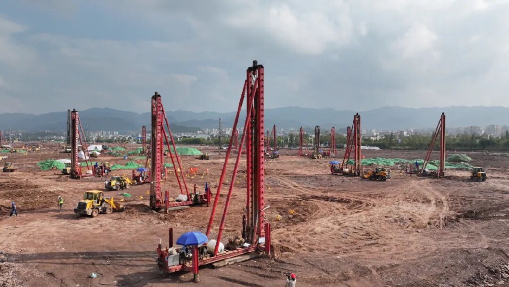 ▲11月4日,特种飞行器智慧工厂项目建设现场,夯扩挤密桩机在夯实地基。