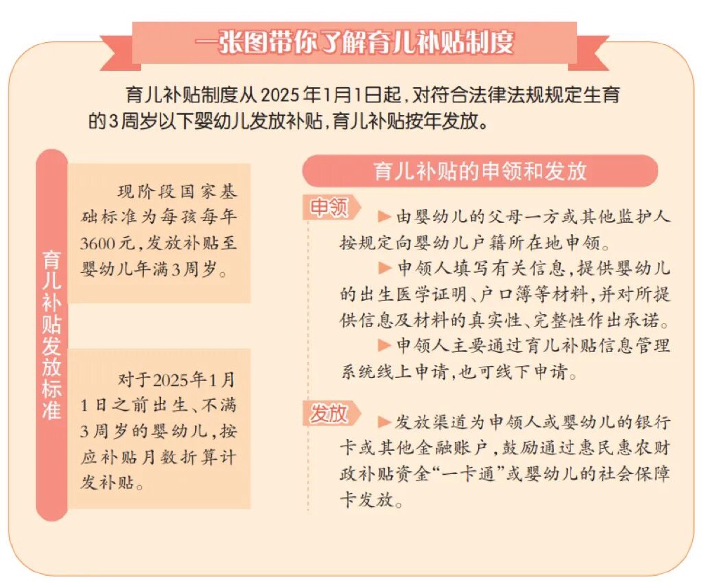 切实为家庭育儿减轻经济压力据了解,此次发放育儿补贴,是根据中共中央办公厅、国务院办公厅印发的《育儿补贴制度实施方案》统一部署实施的。方案规定,自2025年1月1日起,对符合法律法规规定生育的3周岁以下婴幼儿发放补贴,直至其年满3周岁。补贴按年度计算,标准为每孩每年3600元。其中,对2025年1月1日之前出生、不满3周岁的婴幼儿,按应补贴月数折算计发补贴。