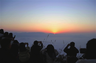 ▲市民正在摩围山看日出。