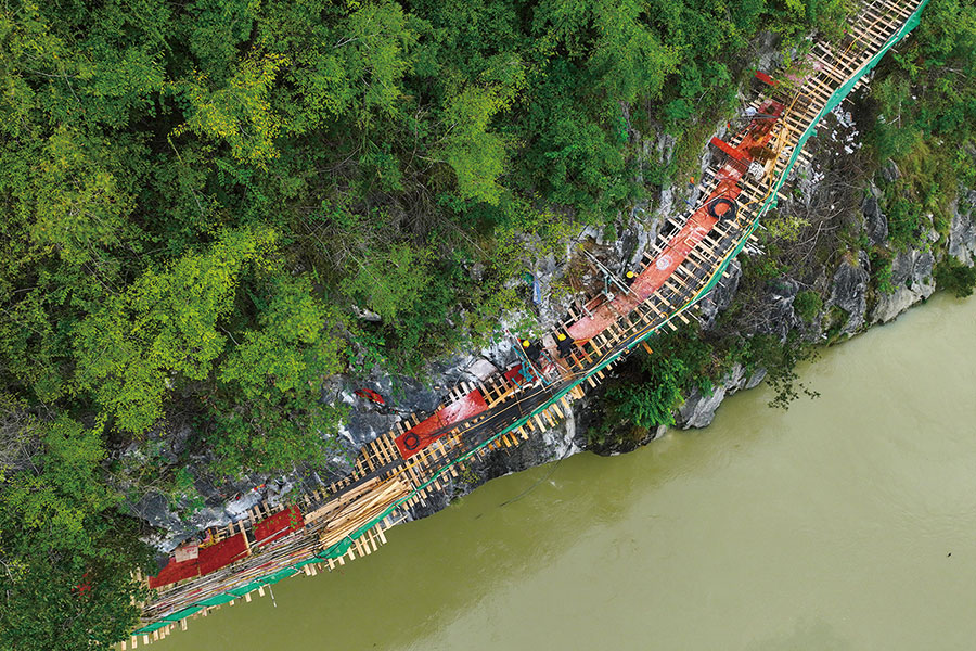 ▲在黔江区神龟峡景区,工人正在修建悬崖观光栈道。