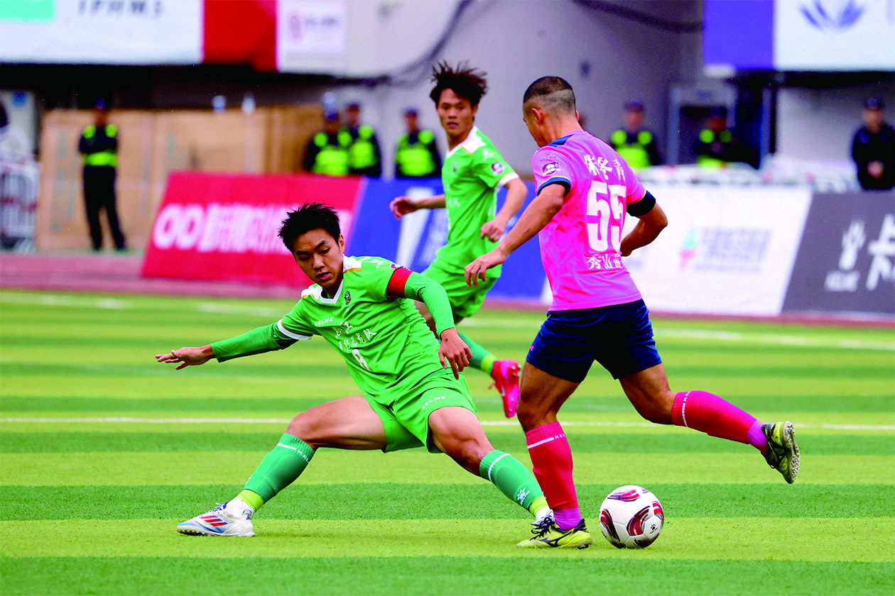 11月1日下午,黔江白垩纪恐龙队(绿衣)坐镇主场迎战秀山毛尖队(红衣)。这是黔江白垩纪恐龙队在“渝超”的第二场主场赛。