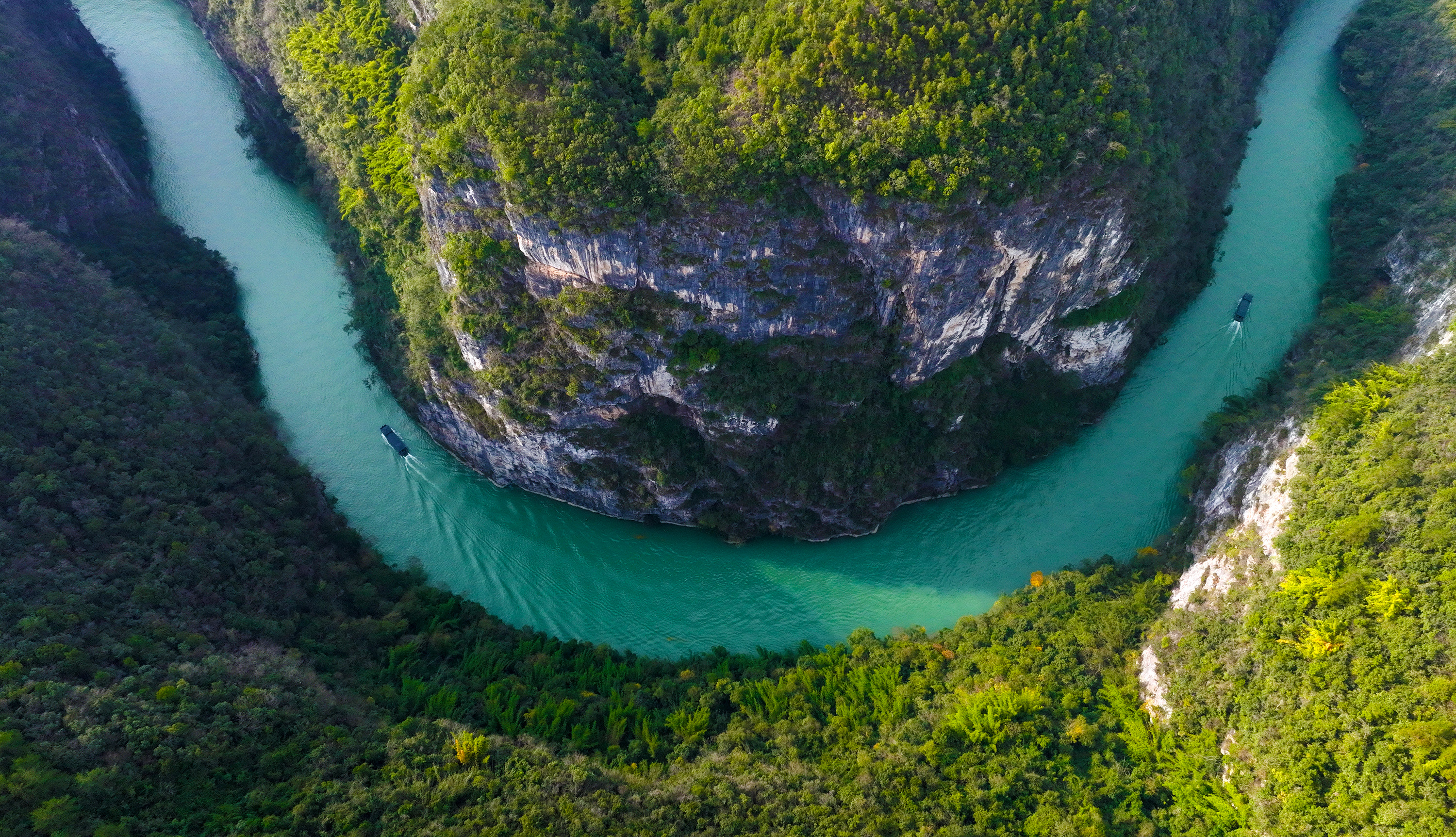 ▲近日,在黔江区神龟峡景区,游客们乘坐游船游览峡谷。
