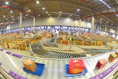 近日,在沙坪坝区永辉物流有限公司常温配送中心,自动化高速分拣线高速运转。据了解,该物流配送中心依托互联网、大数据等先进技术,通过智能高速拣货系统,实现物流配送效率大幅提高。