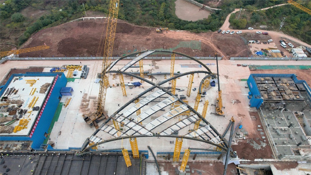 目前,该站已顺利完成混凝土结构封顶,全面进入钢结构施工攻坚阶段,预计明年春节前完成所有钢结构工程,为后续站房装修及设备安装打下坚实基础。