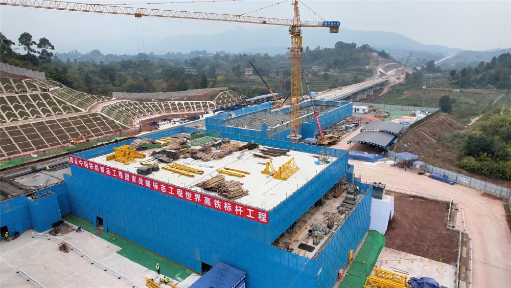 近日,记者在成渝中线高铁铜梁站施工现场看到,现场一片繁忙景象。多台大型机械运转,施工人员各司其职,加紧推进工程建设。