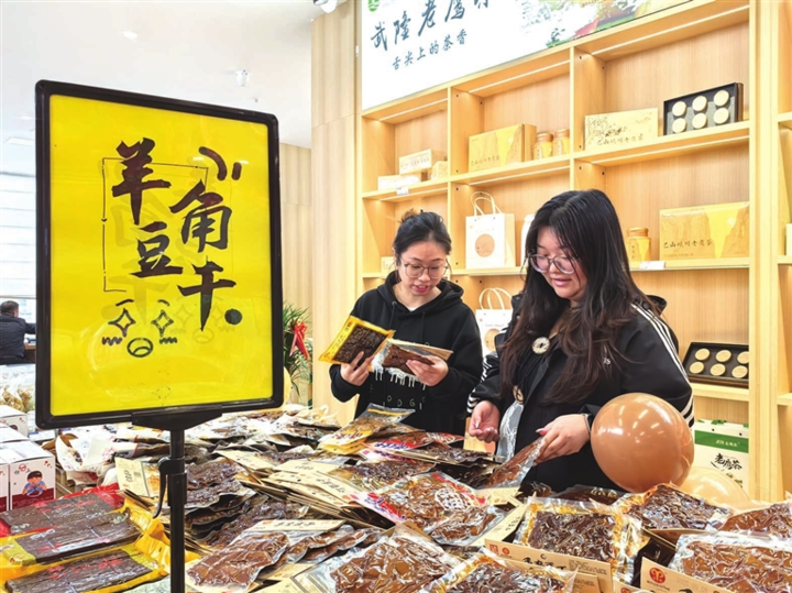 “目前,我们店里面有500多种产品,初级农产品有苕粉、干笋子、洋芋果等,特色农副产品不仅有高山茶、老鹰茶,还有羊角豆干、碗碗羊肉、面条、蜂蜜等,我们也会根据季节的变化,筛选本地的其他产品,比如说当地的时令水果。同时,我们也会精选大重庆的一些特色产品,以此来满足来武游客以及本地居民的选购需求。”武隆农特产品体验馆负责人陈峙屹表示。