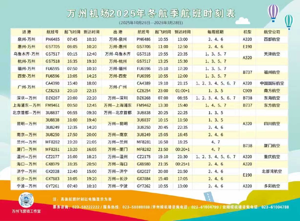 泉州,这座历史悠久的城市,拥有温柔的海风和斑驳的闽南红。万州—泉州航线每周3班,您可以轻松抵达“世界遗产之城”,在香火与美食之间,感受到那份千年海丝的温度。另外,11至12月期间,泉州机场开展延伸服务,10人及以上的团队旅客,乘坐万州至泉州航线,可在泉州起飞前享受免费住宿1晚,免费接驳服务1次,具体参与条件及方式请咨询泉州晋江国际机场客服。
