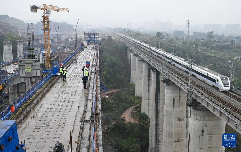 ▲12月25日,列车驶过渝万高铁打青沟左线大桥连续梁建设现场。新华社记者 陈诚 摄