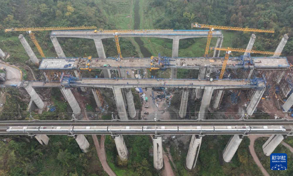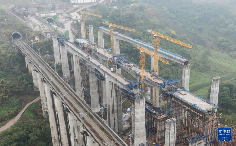 ▲这是12月25日拍摄的渝万高铁打青沟左线大桥连续梁(右二)建设现场(无人机照片)。新华社记者 陈诚 摄