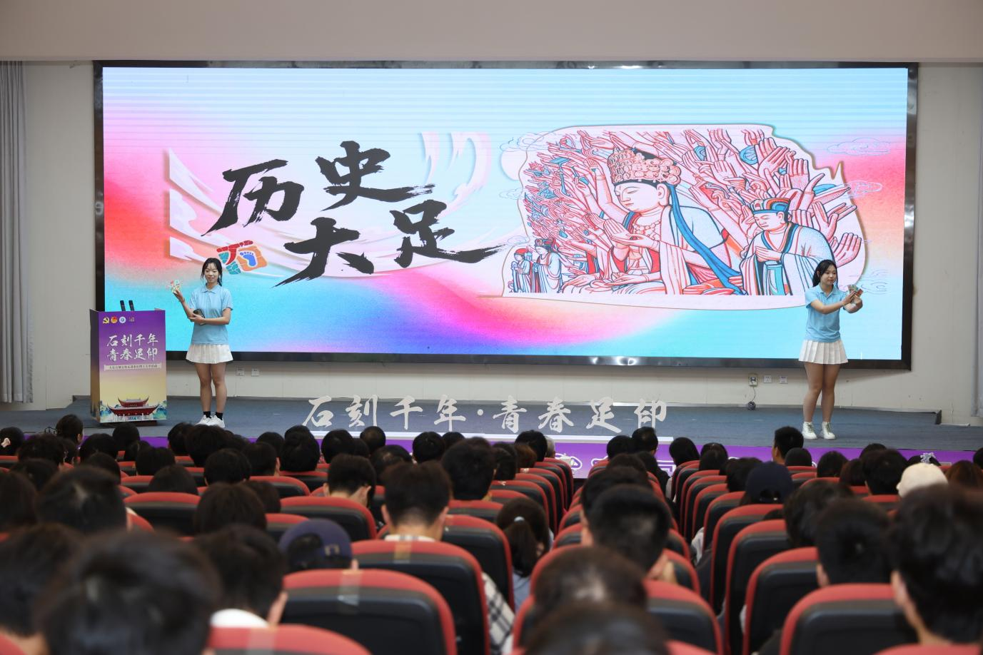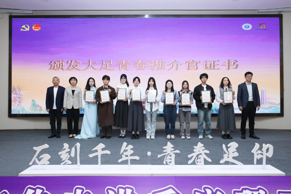 大足石刻研究院讲解员郑悦以《与青春同行,与千年对话:探寻重庆唯一世界遗产大足石刻》为题作主旨演讲,用生动案例解读大足石刻中儒释道合一的文化内涵;团大足区委副书记尹鸿带来《跟着文创游大足石刻》分享,围绕宝顶山千手观音、华严三圣、卧佛等核心造像,介绍文创产品设计理念,激发同学们的创作热情。活动现场还为获选“大足青春推介官”的学生颁发证书,借助这一身份纽带,号召更多青年学子成为石刻文化传播者与实践者。