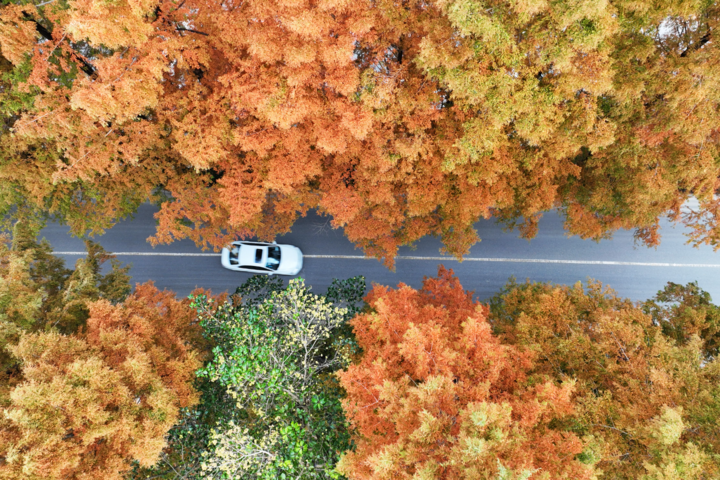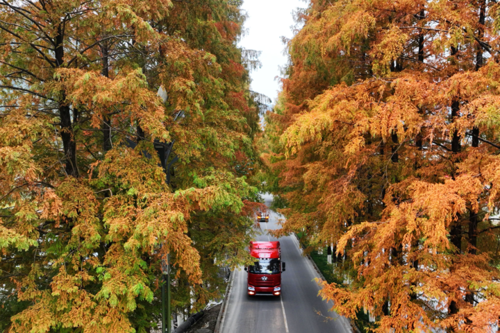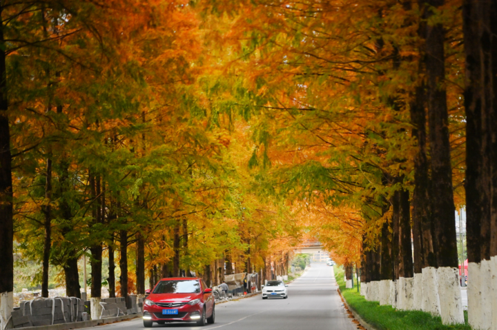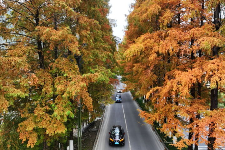 近日,酉阳桃花源街道国道319线道路两侧的水杉等树木褪去翠绿,换上橙黄、绯红的盛装,层层叠叠的秋色将这里装扮成一幅流动的绝美画卷,吸引了众多游客和摄影爱好者前来打卡,成为当地又一网红“公路画廊”。