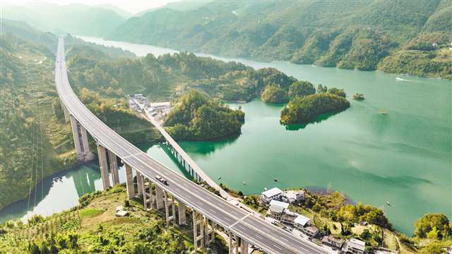 12月5日,酉阳县龚滩镇,渝湘复线高速路蜿蜒铺展,与碧绿的江水、斑斓的山川、和美的村寨交相辉映(无人机照片)。